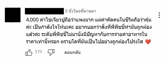 - รุ่นพี่แจ้งว่าจะกลับไปคุยฟีดแบคกับเจ้ไฝ ต่อมาเลยได้ทราบว่าเป็นราคาและรูปแบบอาหารแบบ VVIP ที่เสิร์ฟให้ประจำอยู่แล้วจริง แบบเห็นหน้าก็ทำให้แบบนี้เลยทันที ทำแบบนี้มาตลอด เพียงแต่เพราะรุ่นพี่ไม่เคยสังเกตุบิล ไม่เคยรับรู้เรื่องราคาที่ต่าง เลยงงตอนถามกับพนักงาน และตอบคำถามพีชไม่ได้เรื่องนี้ ไม่มีเจตนาโกงหรืออัพราคา