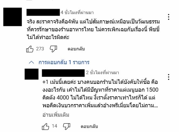 - ที่โพสต์บนโซเชียล ไม่ได้ต้องการเรียกร้องอะไร ไม่ว่าราคาปกติบนเมนู หรือราคาพิเศษก็สะดวกจ่ายถ้าได้รับการแจ้งก่อน แค่อยากแชร์ประสบการณ์ว่าเหตุการณ์แบบนี้อาจมีโอกาสเกิดขึ้นได้ เผื่อคนอื่นมาทานจะได้แจ้งก่อนว่าต้องการพิเศษหรือไม่ ไม่ต้องรอลุ้น เพราะไม่ใช่ทุกคนที่จะเคยเห็นข่าวหรือมีข้อมูลเรื่องราคาพิเศษมาก่อน”
