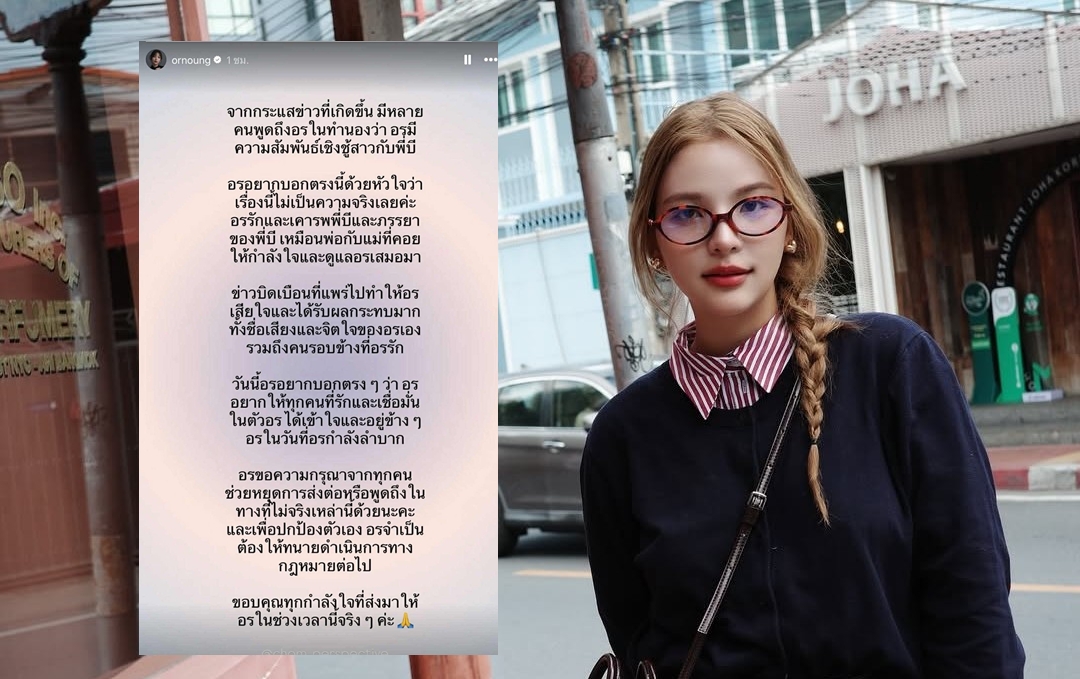 วันนี้อรอยากบอกตรง ๆ ว่า อรอยากให้ทุกคนที่รักและเชื่อมั่นในตัวอร ได้เข้าใจและอยู่ข้าง ๆ อร ในวันที่อรกำลังลำบาก อรขอความกรุณาจากทุกคนช่วยหยุดการส่งต่อหรือพูดถึงในทางที่ไม่จริงเหล่านี้ด้วยนะคะและเพื่อปกป้องตัวเอง อรจำเป็นต้องให้ทนายดำเนินการทางกฎหมายต่อไป ขอบคุณทุกกำลังใจที่ส่งมาให้อรในช่วงเวลานี้จริงๆ ค่ะ”
