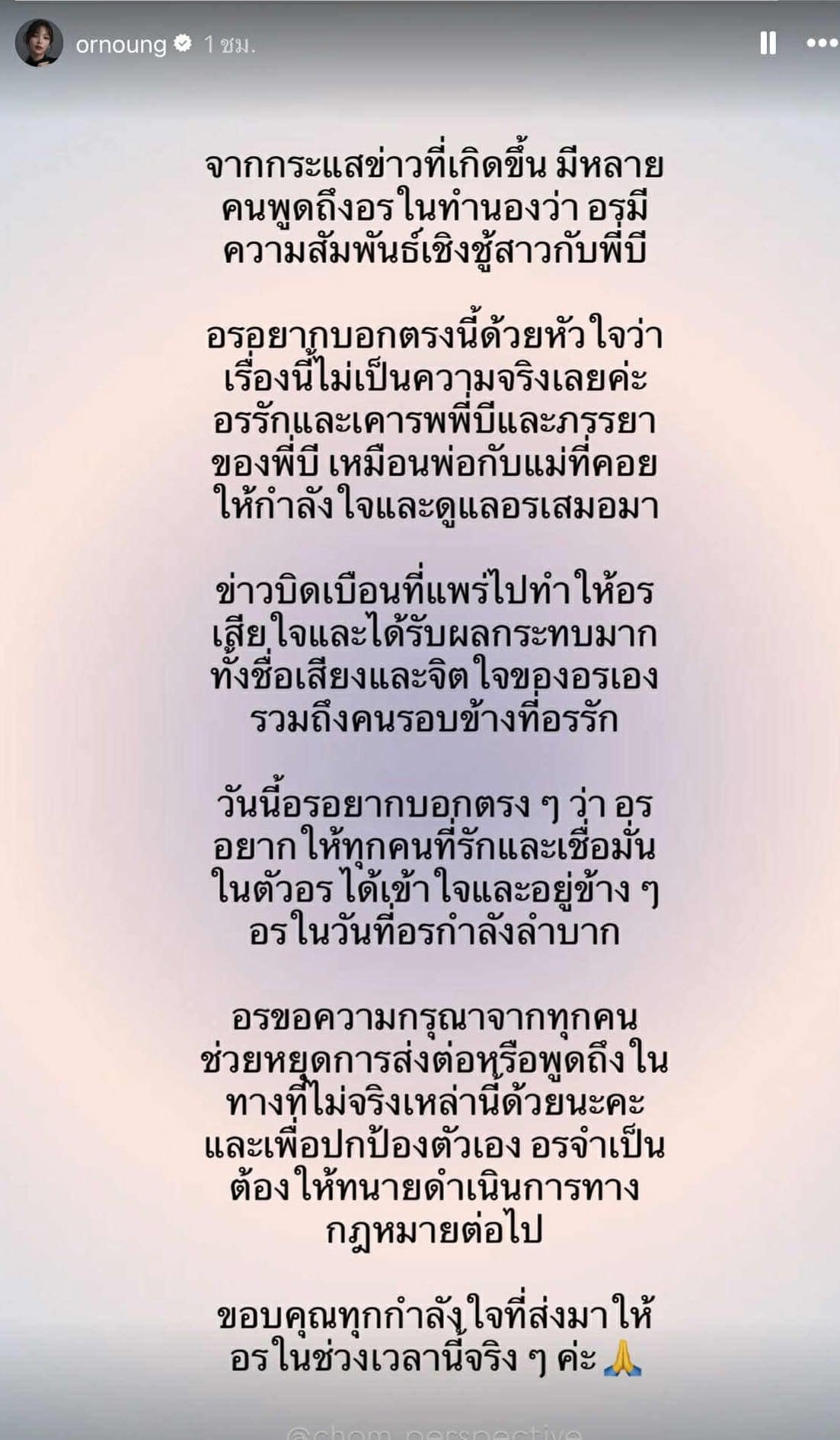“จากกระแสข่าวที่เกิดขึ้น มีหลายคนพูดถึงอร ในทำนองว่าอรมีความสัมพันธ์เชิงชู้สาวกับพี่บี อรอยากบอกตรงนี้ด้วยหัวใจว่า เรื่องนี้ไม่เป็นความจริงเลยค่ะ อรรักและเคารพพีบีและภรรยาของพีบี เหมือนพ่อกับแม่ที่คอยให้กำลังใจและดูแลอรเสมอมา ข่าวบิดเบือนที่แพร่ไปทำให้อรเสียใจและได้รับผลกระทบมาก ทั้งชื่อเสียงและจิตใจของอรเอง รวมถึงคนรอบข้างที่อรรัก