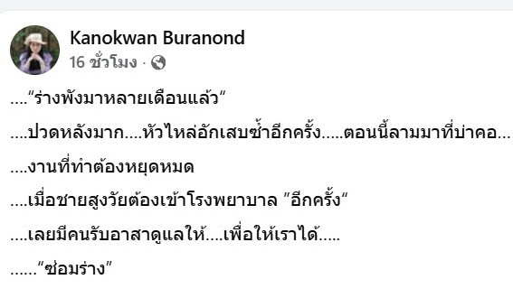 “ร่างพังมาหลายเดือนแล้ว“ ปวดหลังมาก หัวไหล่อักเสบซ้ำอีกครั้ง .ตอนนี้ลามมาที่บ่าคอ งานที่ทำต้องหยุดหมด เมื่อชายสูงวัยต้องเข้าโรงพยาบาล ”อีกครั้ง“ เลยมีคนรับอาสาดูแลให้ เพื่อให้เราได้ “ซ่อมร่าง”