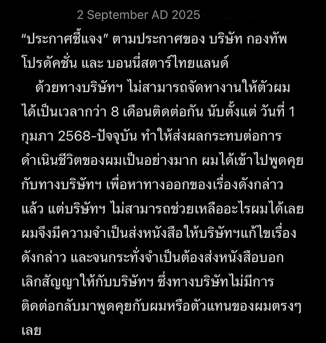 ด้วยทางบริษัทฯ ไม่สามารถจัดหางานให้กับตัวผมได้ เป็นเวลากว่า 8 เดือนติดต่อกัน นับตั้งแต่วันที่ 1 กุมภา 2568-ปัจจุบัน ทำให้ส่งผลกระทบต่อการำเนินชีวิตของผมเป็นอย่างมาก ผมได้เข้าไปพูดคุยกับทางบริษัทฯ ไม่สามารถุช่วยเหลืออะไรผมได้เลย ผมจึงมีความจำเป็นส่งหนังสือให้บริษัทฯ แก้ไขเรื่องดังกล่าว และจนกระทั่งจำเป็นต้องส่งหนังสือบอกเลิกสัญญาให้กับบริษัทฯ ซึ่งทางบริษัทไม่มีการติดต่อกลับมาพูดคุยกับผมหรือตัวแทนของผมตรงๆ เลย