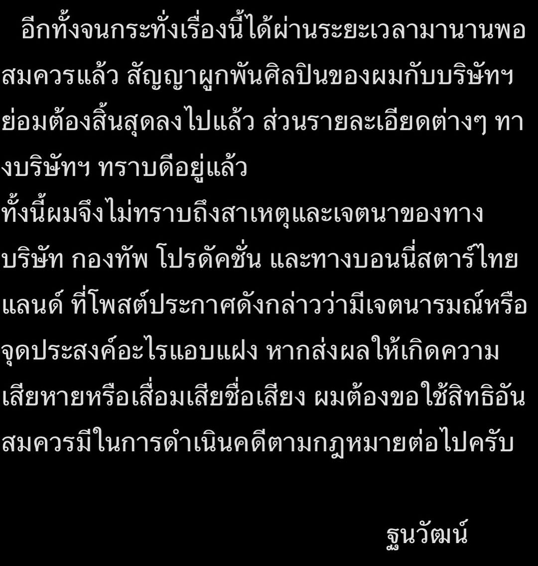 อีกทั้งจนกระทั่งเรื่องนี้ได้ผ่านระยะเวลามานานพอสมควรแล้ว สัญญาผูกพันศิลปินของผมกับบริษัทฯ ย่อมต้องสิ้นสุดลงไปแล้ว ส่วนรายละเอียดต่างๆ ทางบริษัทฯทราบดีอยู่แล้ว ทั้งนี้ผมจึงไม่ทราบถึงสาเหตุและเจตนาของทางบริษัท กองทัพ โปรดักชั่น และทางบอนนี่สตาร์ไทยแลนด์ ที่โพสต์ประกาศดังกล่าวว่ามีเจตนารมณ์หรือจุดประสงค์อะไรแอบแฝง หากส่งผลให้เกิดความเสียหายหรือเสื่อมเสียชื่อเสียง ผมต้องขอใช้สิทธิ์อันสมควรในการดำเนินคดีตามกฎหมายต่อไปครับ...ฐนวัฒน์”