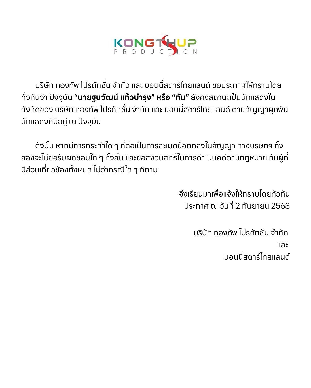 จากที่บริษัทกองทัพ โปรดักชั่น จำกัด และบอนนี่สตาร์ไทยแลนด์ ได้โพสต์เอกสารชี้แจงถึง กัน-ฐนวัฒน์ แก้วบำรุง ว่ายังคงสถานะเป็นนักแสดงในสังกัดตามสัญญาผูกพันนักแสดงที่มีอยู่ ณ ปัจจุบัน พร้อมกับแจ้งอีกว่าหากมีการกระทำใดๆ ที่ถือเป็นการละเมิดข้อตกลงในสัญญา ทางบริษัททั้งสองจะไม่ขอรับปิดชอบใดๆ และขอสงวนสิทธิ์ในการดำเนินคดีตามกฎหมายกับผู้ที่มีส่วนเกี่ยวข้อทั้งหมด ไม่ว่ากรณีใดๆ ก็ตาม