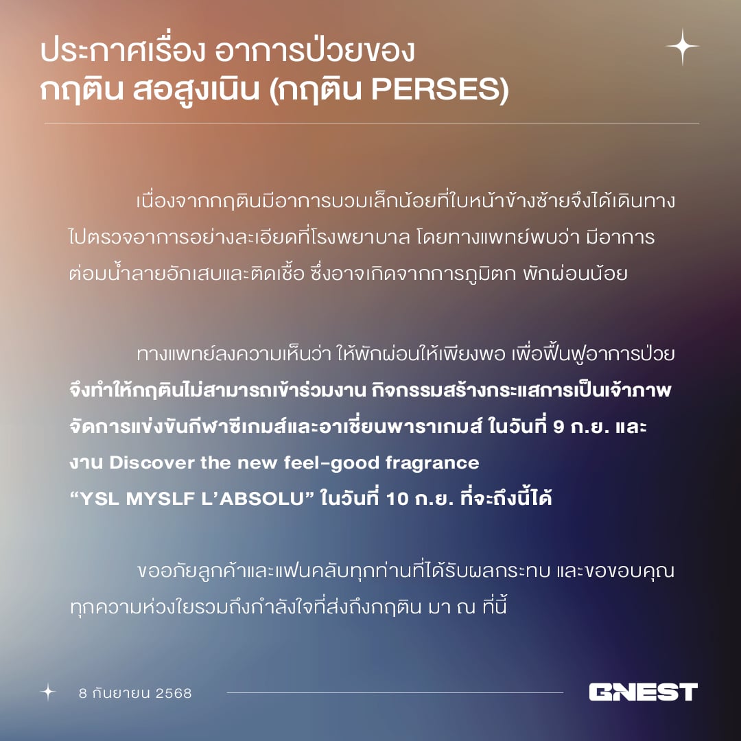 ทำเอาแฟนๆ เป็นห่วงเมื่อ กฤติน สอสูงเนิน หรือ กฤติน PERSES ต้องพักงานอย่างกระทันหัน โดยทางต้นสังกัด GNEST ได้ออกประกาศแจ้งถึงสาเหตุของการต้องพักงานของ กฤติน PERSES ในครั้งนี้ว่า