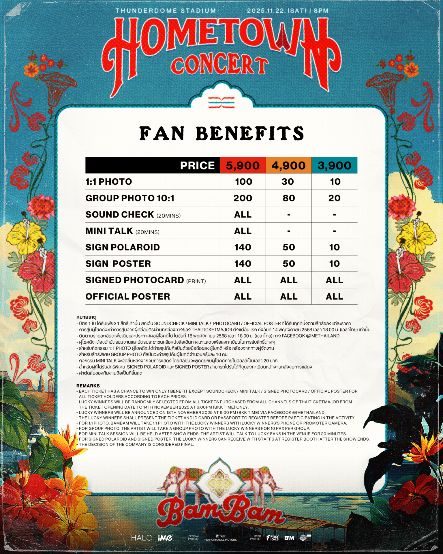 ในงาน 2025 BamBam HOMETOWN Concert in Bangkok ซึ่งจะจัดขึ้นในวันเสาร์ที่ 22 พฤศจิกายน 2568 เวลา 20.00 น. ณ ธันเดอร์โดม สเตเดียม โดยผู้จัดที่ถูกยกให้เป็น Best Partner ของแบมแบม อย่าง iMe Thailand เตรียมเนรมิตโปรดักชั่นให้ยิ่งใหญ่สมศักดิ์ศรี “น้องชายแห่งชาติ” ของคนไทย