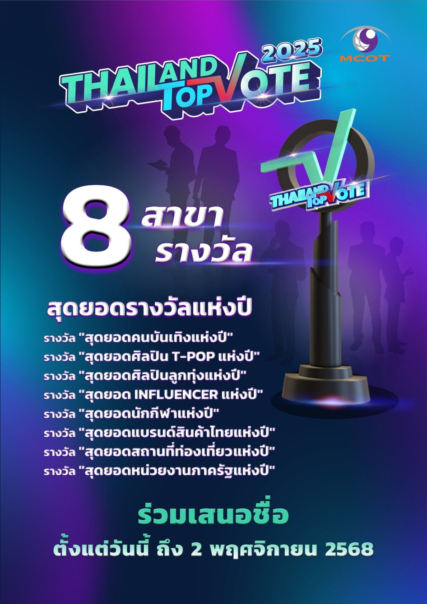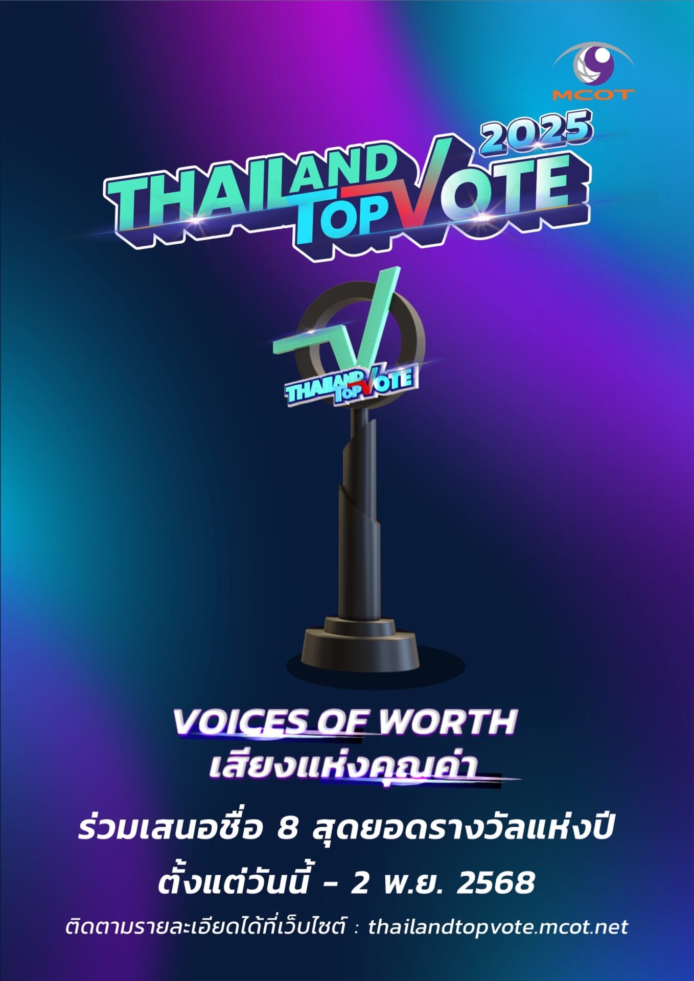 พร้อมเปิดโผ เปิดโหวต 8 สาขารางวัล TOP 5 ของประเทศ กับ “Thailand Top Vote 2025” VOICES OF WORTH เสียงแห่งคุณค่า รางวัลที่สร้างความภาคภูมิใจ สร้างแรงบันดาลใจ พร้อมกำลังใจ ให้กับบุคคลและองค์กรในหลากหลายวงการ จากการร่วมมือระหว่าง บริษัท อสมท จำกัด (มหาชน) และ บริษัท ไปรษณีย์ไทย จำกัด กับ 8 รางวัลที่มาจากการโหวตของคนทั้งประเทศ