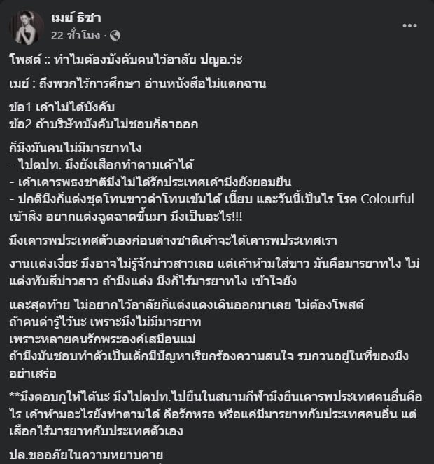 “โพสต์ : ทำไมต้องบังคับคนไว้อาลัย ปญอ.ว่ะ / เมย์ : ถึงพวกไร้การศึกษา อ่านหนังสือไม่แตกฉาน ข้อ1 เค้าไม่ได้บังคับ ข้อ2 ถ้าบริษัทบังคับไม่ชอบก็ลาออก ก็มึงมันคนไม่มีมารยาทไง ไปตปท. มึงยังเสือกทำตามเค้าได้, เค้าเคารพธงชาติมึงไม่ได้รักประเทศเค้ามึงยังยอมยืน, ปกติมึงก็แต่งชุดโทนขาวดำโทนเข้มได้ เนี๊ยบ และวันนี้เป็นไร โรค Colourful เข้าสิง อยากแต่งฉูดฉาดขึ้นมา มึงเป็นอะไร!!! มึงเคารพประเทศตัวเองก่อนต่างชาติเค้าจะได้เคารพประเทศเรา งานเเต่งมึงอาจไม่รู้จักบ่าวสาวเลย แต่เค้าห้ามใส่ขาว มันคือมารยาทไง ไม่แต่งทับสีบ่าวสาว ถ้ามึงแต่ง มึงก็ไร้มารยาทไง เข้าใจยัง