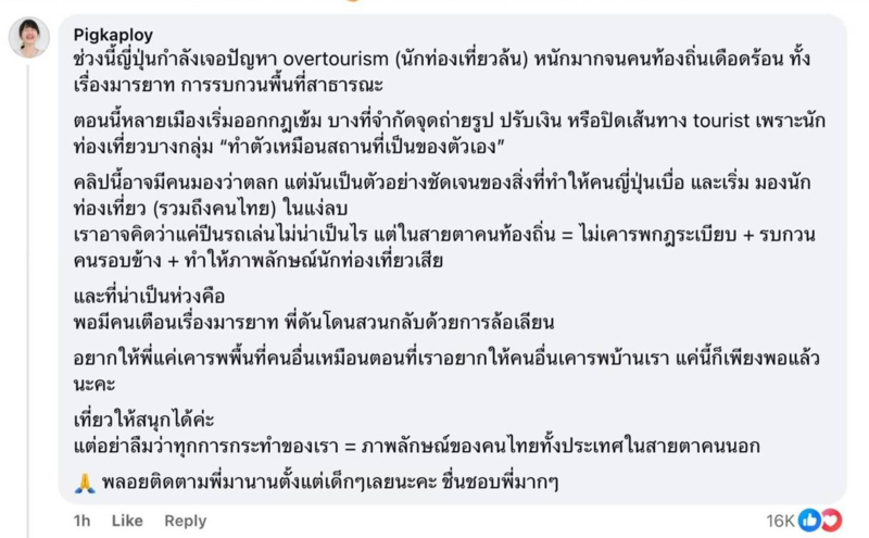 งานนี้นางเอกสาวที่ชื่นชอบการท่องเที่ยวอย่าง พลอย-พลอยไพลิน ตั้งประภาพร ก็ได้เข้ามาคอมเมนต์ตักเตือนให้อีกฝ่ายเคารพพื้นที่คนอื่นเหมือนตอนที่เราอยากให้คนอื่นเคารพบ้านเรา “ช่วงนี้ญี่ปุ่นกำลังเจอปัญหา overtourism (นักท่องเที่ยวล้น) หนักมากจนคนท้องถิ่นเดือดร้อน ทั้งเรื่องมารยาท การรบกวนพื้นที่สาธารณะ ตอนนี้หลายเมืองเริ่มออกกฎเข้ม บางที่จำกัดจุดถ่ายรูป ปรับเงิน หรือปิดเส้นทาง tourist เพราะนักท่องเที่ยวบางกลุ่ม “ทำตัวเหมือนสถานที่เป็นของตัวเอง”