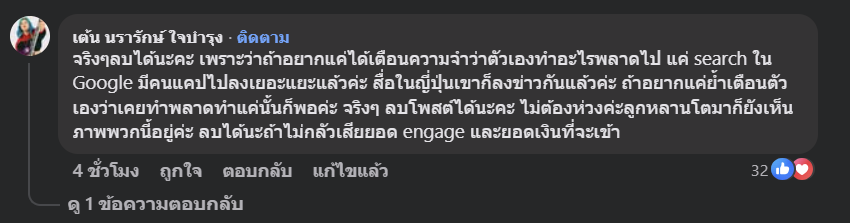 ด้านนักร้องสาวเสียงดี เต้น-นรารักษ์ ใจบำรุง ก็ได้แสดงความเห็นว่า “จริงๆลบได้นะคะ เพราะว่าถ้าอยากแค่ได้เตือนความจำว่าตัวเองทำอะไรพลาดไป แค่ search ใน Google มีคนแคปไปลงเยอะแยะแล้วค่ะ สื่อในญี่ปุ่นเขาก็ลงข่าวกันแล้วค่ะ ถ้าอยากแค่ย้ำเตือนตัวเองว่าเคยทำพลาดทำแค่นั้นก็พอค่ะ จริงๆ ลบโพสต์ได้นะคะ ไม่ต้องห่วงค่ะลูกหลานโตมาก็ยังเห็นภาพพวกนี้อยู่ค่ะ ลบได้นะถ้าไม่กลัวเสียยอด engage และยอดเงินที่จะเข้า”