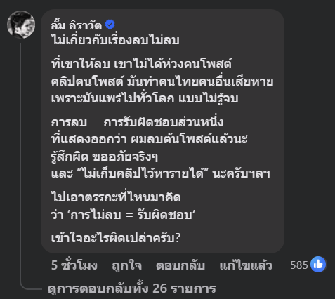 อั้ม-อิราวัต อารีกิจ คุณหมอหนุ่มอดีตนักร้องดังก็ถามกลับว่าเข้าใจผิดอะไรหรือเปล่า “ไม่เกี่ยวกับเรื่องลบไม่ลบ ที่เขาให้ลบ เขาไม่ได้ห่วงคนโพสต์ คลิปคนโพสต์ มันทำคนไทยคนอื่นเสียหาย เพราะมันแพร่ไปทั่วโลก แบบไม่รู้จบ การลบ = การรับผิดชอบส่วนหนึ่ง ที่แสดงออกว่า ผมลบต้นโพสต์แล้วนะ รู้สึกผิด ขออภัยจริงๆ” และ “ไม่เก็บคลิปไว้หารายได้” นะครับฯลฯ ไปเอาตรรกะที่ไหนมาคิด ว่า ’การไม่ลบ = รับผิดชอบ‘ เข้าใจอะไรผิดเปล่าครับ?”