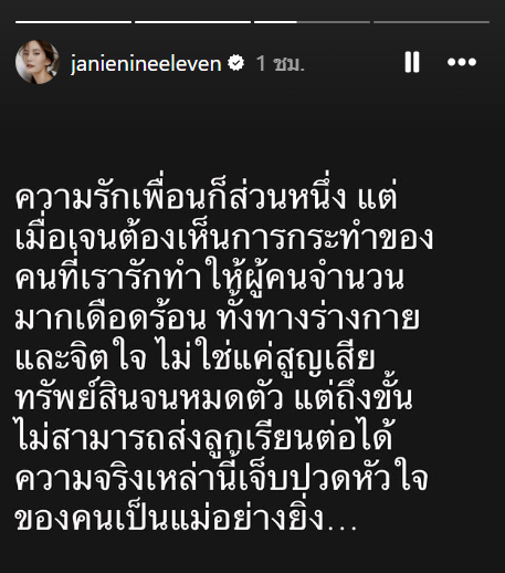 “ความรักเพื่อนก็ส่วนหนึ่ง แต่ เมื่อเจนต้องเห็นการกระทำของคนที่เรารักทำให้ผู้คนจำนวนมากเดือดร้อน ทั้งทางร่างกายและจิตใจ ไม่ใช่แค่สูญเสียทรัพย์สินจนหมดตัว แต่ถึงขั้นไม่สามารถส่งลูกเรียนต่อได้ ความจริงเหล่านี้เจ็บปวดหัวใจของคนเป็นแม่อย่างยิ่ง...