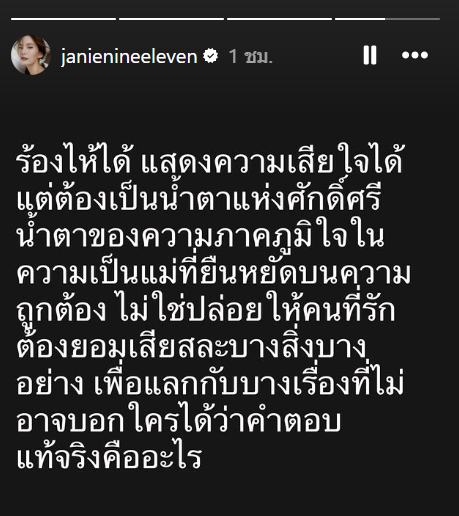 ร้องไห้ได้ แสดงความเสียใจได้ แต่ต้องเป็นน้ำตาแห่งศักดิ์ศรี น้ำตาของความภาคภูมิใจในความเป็นแม่ที่ยืนหยัดบนความถูกต้อง ไม่ใช่ปล่อยให้คนที่รักต้องยอมเสียสละบางสิ่งบางอย่าง เพื่อแลกกับบางเรื่องที่ไม่อาจบอกใครได้ว่าคำตอบแท้จริงคืออะไร”