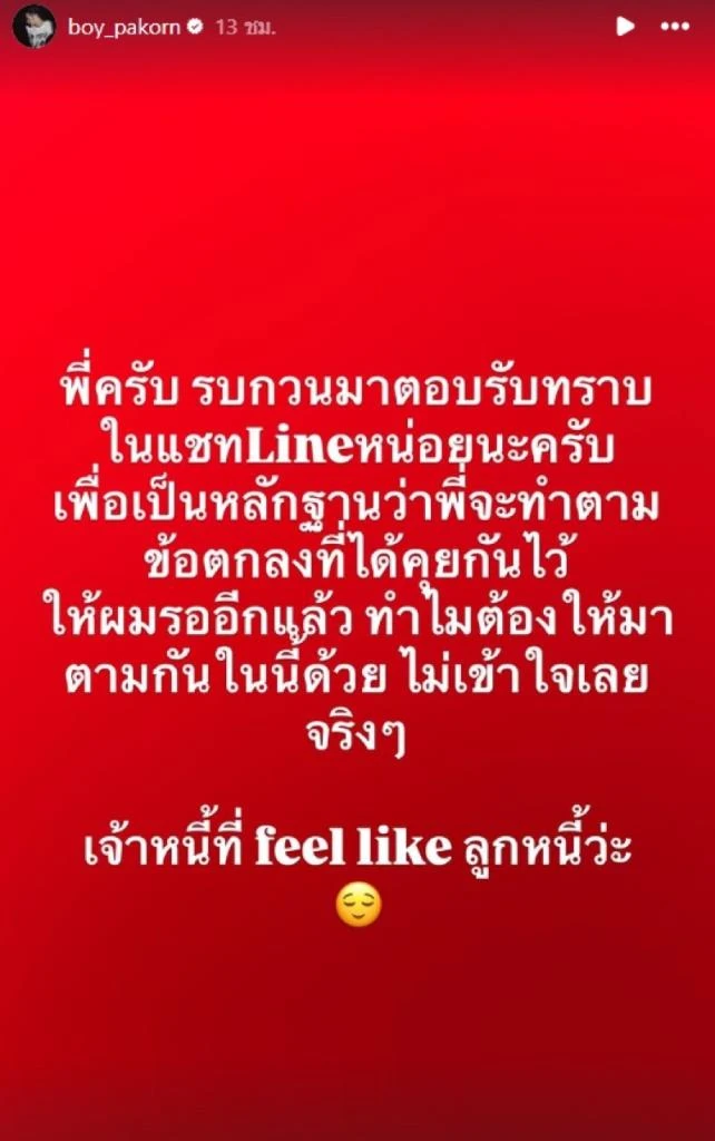 (หลังจากเป็นข่าวมีติดต่อกลับมามั้ย) ผมโพสต์ 2 ครั้ง เมื่อวันศุกร์ตอนกลางคืน เพราะว่าวันศุกร์ผมมีนัดเพื่อเซ็นเอกสารกับเขา แต่เอาเป็นว่าไม่ได้เซ็นก็แล้วกัน วันศุกร์ผมก็เลยโพสต์ไปอย่างนั้นว่าผมไม่รู้ว่าจะทำยังไงแล้ว ตามตัวไม่ได้เลย เขาก็ไม่ได้รับสายผมตั้งแต่วันศุกร์ มาเสาร์อาทิตย์ผมก็ไม่อยากตาม ก็เห็นว่ามันเป็นวันหยุด เรารู้สึกว่าเป็นวันครอบครัว ผมไม่ตาม พอมาเมื่อวานเขาก็ยังไม่โทรมา ผมก็เลยโทรไปก็ตามตัวกันอยู่สักพักหนึ่ง ไม่ได้ตามได้ง่ายๆ ทันที เมื่อวานก็ได้คุยกันจนเหมือนว่าจะโอเค แต่สุดท้ายที่ผมพิมพ์อีกทีเมื่อคืนเพราะว่าพอผมมีข้อตกลงเข้าไปในไลน์ เพื่อให้ต้องการเป็นหลักฐานว่าคุยกันแล้วนะว่าคุยกันแบบนี้ รบกวนช่วยรับทราบให้ผมหน่อย เขาก็ไม่รับทราบให้ ผมก็รอครึ่งชั่วโมง ผมก็พิมพ์ไปอีกครั้งหนึ่งเขาก็ไม่ตอบ ก็เลยรู้สึกว่าถ้าตามในนี้ไม่ได้ก็ขอตามในสตอรี่แล้วกัน