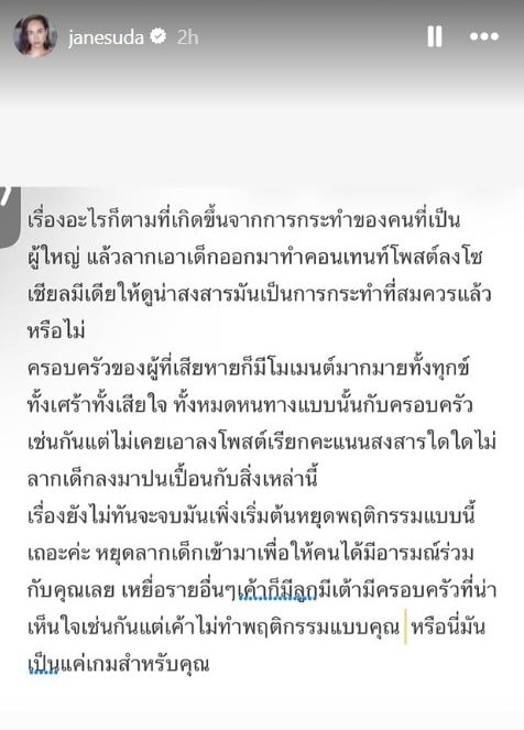 “เรื่องอะไรก็ตามที่เกิดขึ้นจากการกระทำของคนที่เป็นผู้ใหญ่ แล้วลากเอาเด็กออกมาทำคอนเทนต์โพสต์ลงโซเชียลมีเดียให้ดูน่าสงสาร มันเป็นการกระทำที่สมควรแล้วหรือไม่ ครอบครัวของผู้ที่เสียหาย ก็มีโมเมนต์มากมายทั้งทุกข์ทั้งเศร้าทั้งเสียใจ ทั้งหมดหนทางแบบนั้นกับครอบครัวเช่นกัน แต่ไม่เคยเอาลงโพสต์เรียกคะแนนสงสารใดๆ ไม่ลากเด็กลงมาปนเปื้อนกับสิ่งเหล่านี้