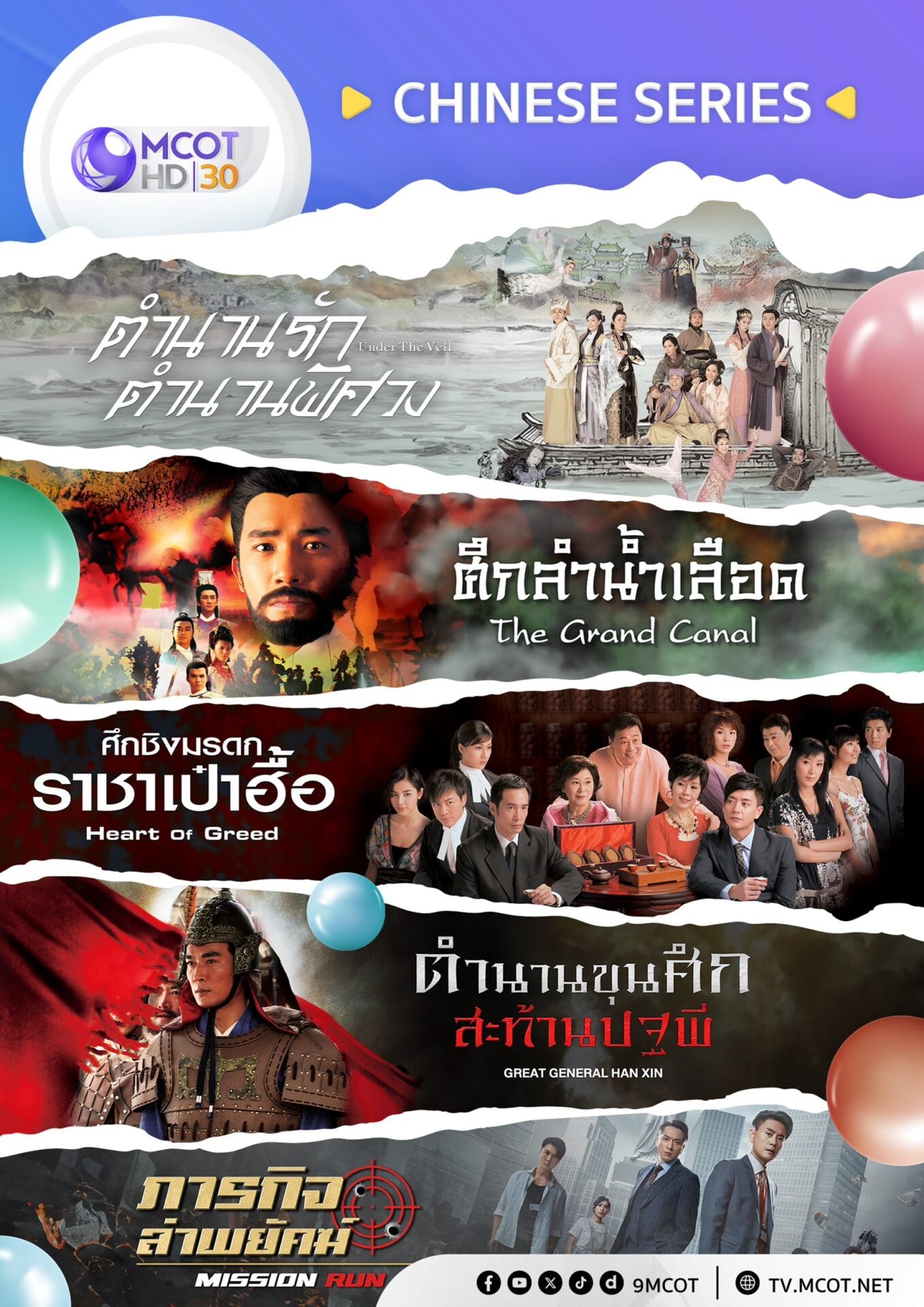 ในส่วนของซีรีส์จีน ช่อง 9 ร่วมกับ บริษัท เอ็มวี ทีวี (ไทยแลนด์) จำกัด พร้อมส่งลงจออย่างต่อเนื่อง ทุกวันจันทร์-พฤหัสบดี เวลา 13.00 น. พบกับซีรีส์ย้อนยุคเรื่อง ตำนานรัก ตำนานพิศวง ส่วน วันจันทร์-ศุกร์ เวลา 16.00 น. พบกับซีรีส์ ศึกลำน้ำเลือด เวลา 23.00 น. พบกับซีรีส์ ศึกชิงมรดกราชาเป๋าฮื้อ ปิดท้ายทุกวันเสาร์-อาทิตย์ เวลา 17.00 น. พบกับซีรีส์ ตำนานขุนศึกสะท้านปฐพี ในเวลา 18.00 น. พบกับซีรีส์แอ็กชันฟอร์มใหญ่เรื่อง ภารกิจล่าพยัคฆ์ และทุกสุดสัปดาห์รับชมซีรีส์วาย ที่พร้อมลงจอในเวลา 23.00 น.