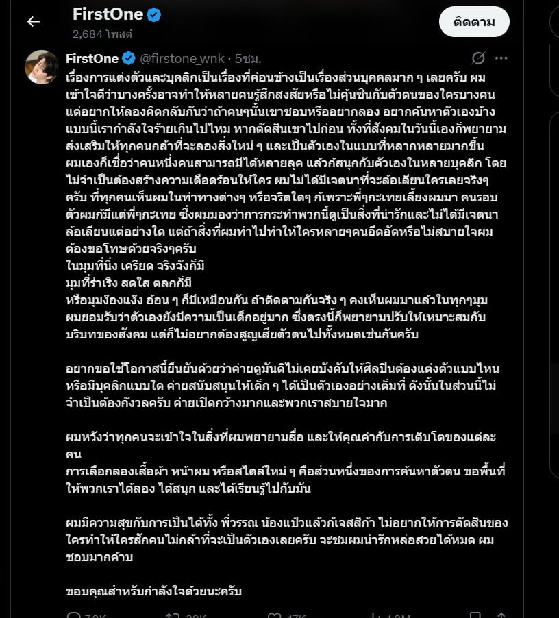จากประเด็นดรามาที่มีการถกเถียงกันใน X กรณีของนักแสดงซีรีส์วายค่ายดูมันดิ เฟิร์สวัน-วรรณกร เรืองรัตน์ ที่มีการแต่งตัวแนวเฟมินีนและเสิร์ฟจริตที่ดูไม่เป็นธรรมชาติ แถมยังมีบางคนโยงไปว่าเฟิร์สวันหากินกับอัตลักษณ์ ของคนในคอมมู LGBTQIA+ ซึ่งล่าสุดทางด้านเจ้าตัวก็ออกมาโพสต์แสดงความคิดเห็นเกี่ยวกับเรื่องดังกล่าว
