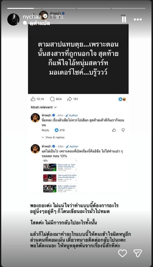 ซึ่งทาง ณิชา ที่กว่าจะผ่านมรสุมการเลิกรามาได้ก็เจ็บปวดเป็นอย่างมาก ซึ่งเมื่อมาเห็นข่าวที่กลับมาพัวพันกับตนเองอีกก็สวนกลับทันที “พอเถอะค่ะ ไม่แน่ใจว่าทำแบบนี้ต้องการอะไร อยู่นิ่งๆ อยู่ดีๆ ก็โดนเขียนอะไรมั่วไปหมด โสดค่ะ ไม่มีการกลับไปอะไรทั้งนั้น แล้วก็ไม่ต้องมาทำอะไรแบบนี้ให้คนเข้าใจผิดหนูอีก ส่วนคนที่คอมเมนต์ เดี๋ยวทนายติดต่อกลับไปนะคะ พอได้ละเนอะ ให้หนูหลุดพ้นจากเรื่องนี้สักทีค่ะ”