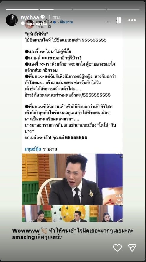 นอกจากนี้ได้ชี้แจงอีกว่า “ขอพิมพ์ชี้แจงไว้ตรงนี้นะคะ เนื่องจากมีคนเข้าใจผิดว่าข่าวคู่รักรีเทิร์นเป็นหนูเยอะมากๆ ก่อนอื่นหนูขอถามเลยว่าไม่มีอะไรจะเขียนจะลงกันแล้วเหรอคะ ถึงทำให้คนเข้าใจผิดคนๆ นึงได้ขนาดนี้ หนูทำอะไรผิดเหรอคะ ถึงต้องมาโดนอะไรแบบนี้ คอยโดนลากกลับไปในเรื่องนี้ ทั้งที่สิ่งที่ทุกคนเขียนมา “ไม่มีอะไรที่เป็นความจริงเลย” หนูมีคุณค่าในตัวเองพอค่ะ ที่ผ่านมาหนูพยายามอย่างมากที่จะไม่ไปเกี่ยวข้องกับเรื่องดังกล่าว เพื่อไม่ให้มีการลืออะไรที่ผิดๆ และเพื่อที่จะได้หลุดพ้นออกไปจากเรื่องนี้ให้ไวที่สุด ปล่อยให้หนูหลุดพ้นจากเรื่องนี้สักทีเถอะนะคะ อย่าลากหนูกลับไปอีกเลยค่ะ ขอบคุณค่ะ”