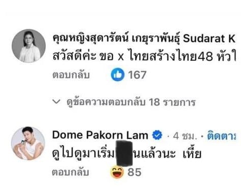หลังจากที่โซเชียลแห่พูดถึงกรณีที่นักร้อง-นักแสดงหนุ่ม โดม-ปกรณ์ ลัม คอมเมนต์ภาพของ จินนี่-ยศสุดา ลีลาปัญญาเลิศ ลูกสาวของคุณหญิงสุดารัตน์ เกยุราพันธุ์ หัวหน้าพรรคไทยสร้างไทย ด้วยประโยคที่มีลักษณะคุกคามทางเพศว่า “ดูไปดูมาเริ่มเงี่xนแล้วนะ เหี้x” จนถูกโซเชียลวิพากษ์วิจารณ์อย่างหนัก