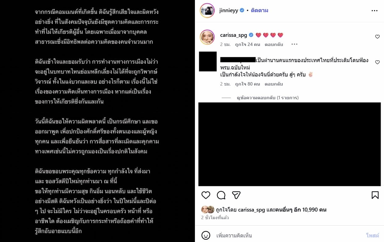 ล่าสุด จินนี่ ยศสุดา โดยโพสต์ข้อความผ่านอินสตาแกรมถึงประเด็นร้อนที่เกิดขึ้นว่า “จากกรณีคอมเมนต์ที่เกิดขึ้น ดิฉันรู้สึกเสียใจและผิดหวังอย่างยิ่ง ที่ในสังคมปัจจุบันยังมีชุดความคิดและการกระทำที่ไม่ให้เกียรติผู้อื่น โดยเฉพาะเมื่อมาจากบุคคลสาธารณะซึ่งมีอิทธิพลต่อความคิดของคนจำนวนมาก