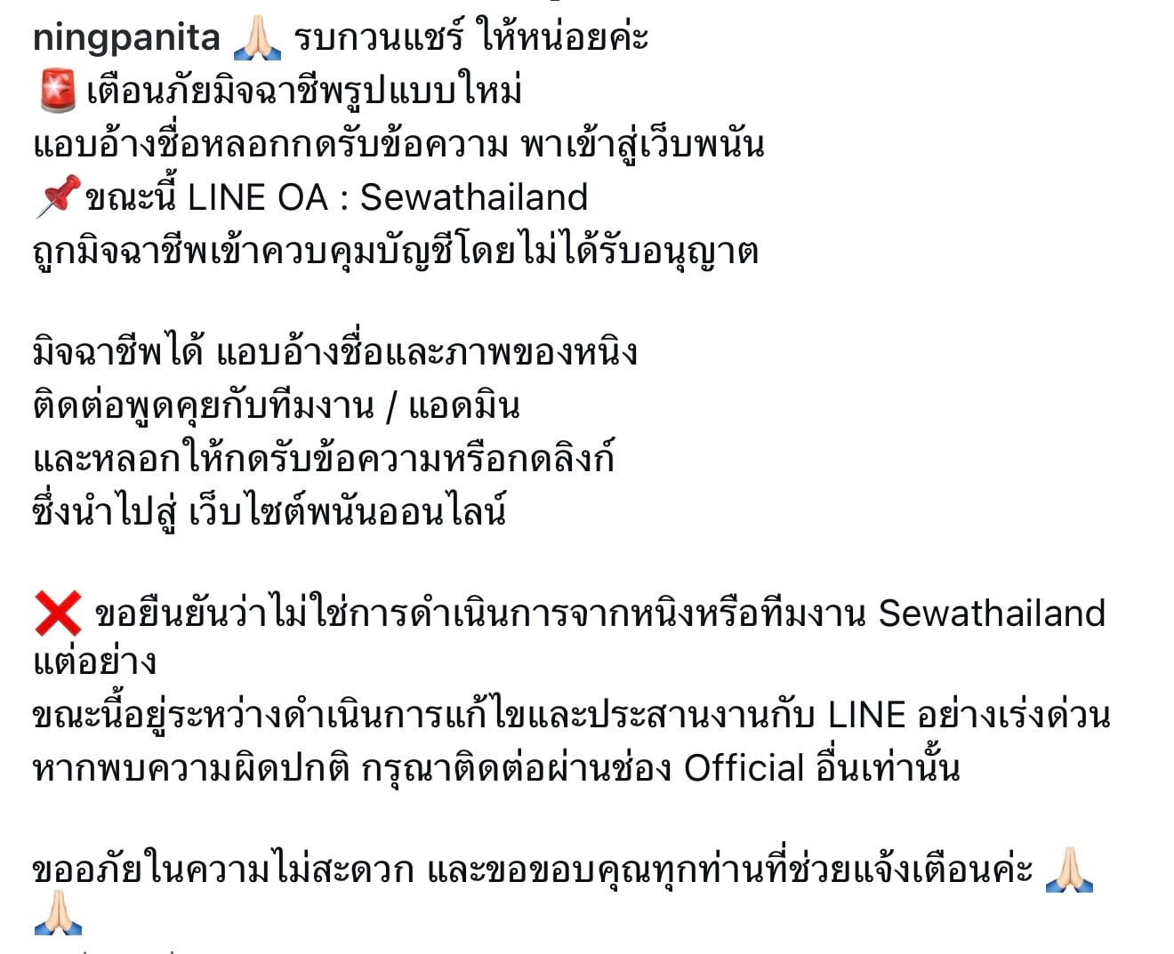 โดย ‘หนิง ปณิตา’ ก็ได้ออกมาโพสต์เคลื่อนไหวและขอความช่วยเหลือ ระบุว่า “ขณะนี้ LINE OA ชื่อ Sewathailand ถูกผู้ไม่หวังดีเข้าควบคุมบัญชีโดยไม่ได้รับอนุญาต และถูกนำไปใช้เป็นเครื่องมือหลอกลวงประชาชน” พร้อมยืนยันชัดเจนว่า ไม่ใช่การดำเนินงานจากตัวหนิงหรือทีมงาน Sewathailand แต่อย่างใด
