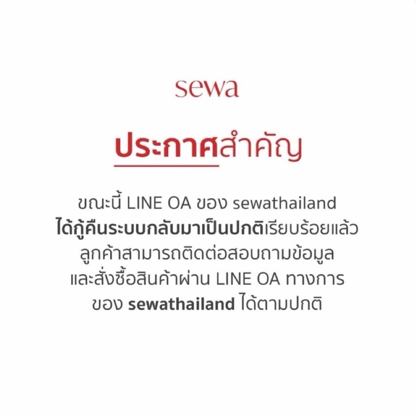 แต่ล่าสุดเมื่อกลางดึกที่ผ่านมา ทางช่องทางออฟฟิเซียลของ sewathailand ได้ออกประกาศว่าสามารถกู้คืนระบบกลับมาเป็นปกติแล้ว และฝากเตือนไปยังลูกค้าของ เซวา ที่ได้รับข้อความหรือลิงก์ดังกล่าว ขอความกรุณาอย่ากดลิงก์ และลบข้อความทิ้งทันที