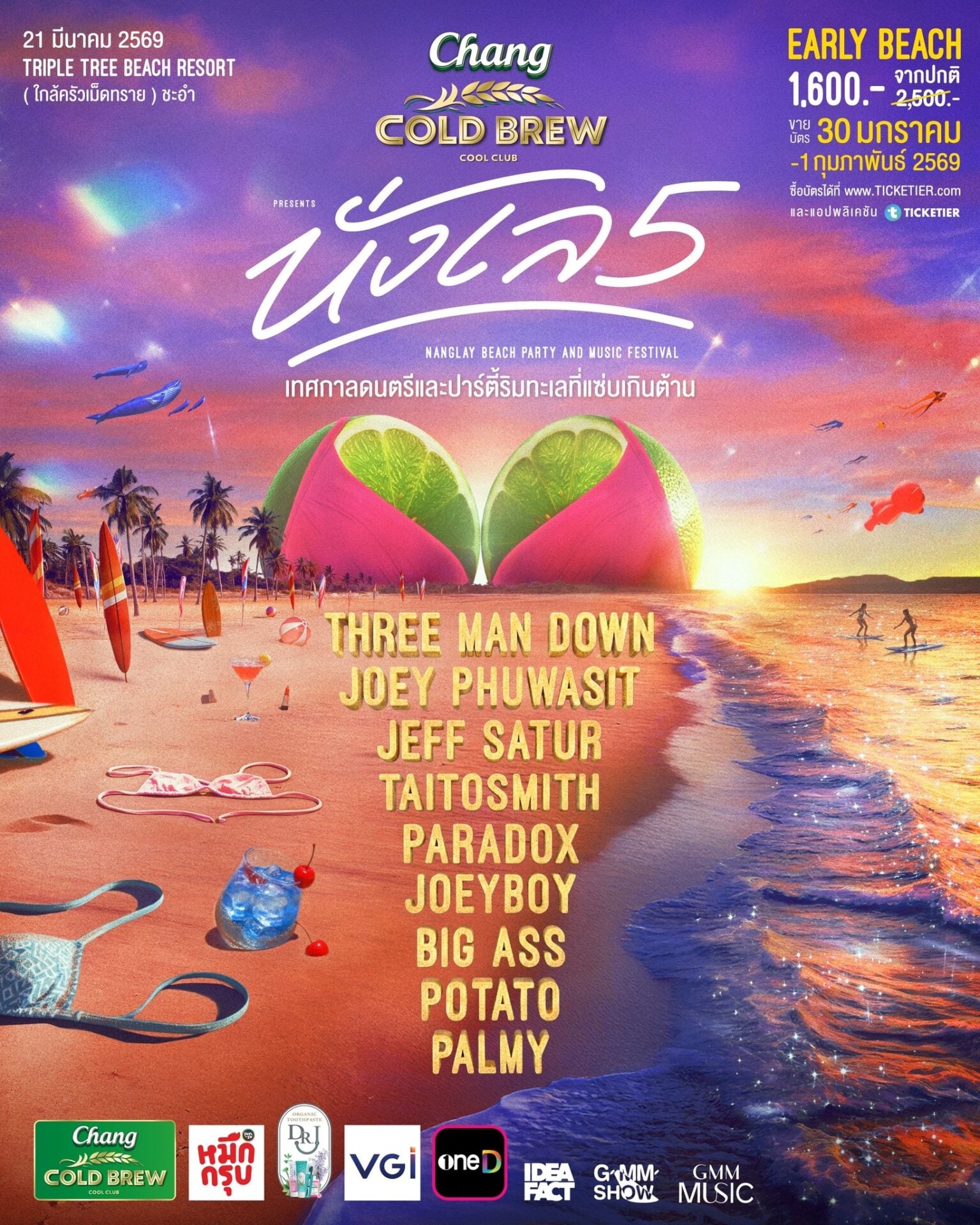 Chang Cold Brew Cool Club Presents “นั่งเล 5” ถือเป็นการยืนยันว่าพร้อมมอบประสบการณ์ความสนุกสำหรับทุกคน ไม่ว่าจะเป็นสายปาร์ตี้ สายชิล และสายไลฟ์สไตล์ โดยทั้งหมดนี้ต้องมาสัมผัสด้วยตัวเอง เตรียมตัวซื้อบัตร Early Bird โอกาสเดียวที่จะได้บัตรในราคาที่คุ้มค่าที่สุด เพียง 1,600 บาท! (จากราคาปกติ 2,500 บาท) ในวันศุกร์ที่ 30 มกราคม 2569 เวลา 09.00 น. ถึงวันอาทิตย์ที่ 1 กุมภาพันธ์ 2569 ทาง www.TICKETIER.com และ TICKETIER Application และอัปเดตข้อมูลเพิ่มเติมได้ทาง FB / IG : NanglayBeachPartyAndMusicFestival และ Tiktok / Twitter : @Nanglayfest