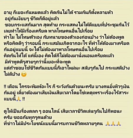 เตือน ใครจะพิมพ์อะไร ก็ระวังกันด้วยนะครับ บางคนยิ่งหิวๆเงินกันอยู่ เดี๋ยวต้องมาเสียเงินเสียเวลาโดยใช่เหตุเพราะเรื่องไร้สาระ แบบนี้!! ดูให้เป็นเรื่องตลก ๆ ออนไลน์ เสียเวลาชีวิตเล่นๆกันไปก็พอนะครับ ขออภัยทุกๆคนด้วย ที่ข่าวไม่มีประโยชน์แบบนี้มารบกวนชีวิตหลายๆคน”