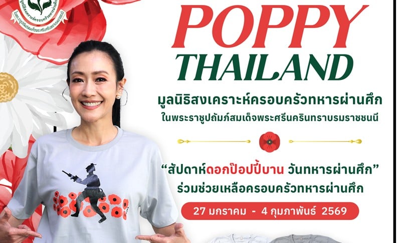 โดยได้ผู้ประกาศข่าวรายการเที่ยงวันทันเหตุการณ์อย่าง ดร.หมวย-อริสรา กำธรเจริญ รวมตัวนักแสดง ลีน่า-ลลินา ชูเอ็ทท์, เซ้นต์-ศุภพงษ์ อุดมแก้วกาญจนา พร้อม 2 ผู้ประกาศ แคน-อติรุจ กิตติพัฒนะ, เซน-เมจกา สุพิชญางกูร นัดสวมเสื้อหนึ่งในผลิตภัณฑ์จากมูลนิธิสงเคราะห์ครอบครัวทหารผ่านศึก ในพระราชูปถัมภ์สมเด็จพระศรีนครินทราบรมราชชนนี เดินหน้าส่งต่อเรื่องดีๆ ชวนร่วมเลือกซื้อดอกป๊อปปี้ ดอกไม้ที่ระลึกสัญลักษณ์วันทหารผ่านศึก พร้อมหลากหลายผลิตภัณฑ์ของมูลนิธิฯ เพื่อหารายได้ช่วง “สัปดาห์ดอกป๊อปปี้บานวันทหารผ่านศึก” โดยเริ่มตั้งแต่วันนี้ - 4 กุมภาพันธ์ 2569 ทั้งนี้ประชาชนทั่วไปสั่งซื้อดอกป๊อปปี้และ ผลิตภัณฑ์ได้ที่ มูลนิธิสงเคราะห์ครอบครัวทหารผ่านศึก ในพระราชูปถัมภ์สมเด็จพระศรีนครินทราบรมราชชนนี โทร.02-2453303, 092-7502642 ID Line : @poppythailand หรือเชิญซื้อผลิตภัณฑ์ทางลิงค์นี้ได้เลยค่ะ https://shop.line.me/@poppythailan หรือบริจาคได้ที่ ธนาคารกสิกรไทย สาขาสนามเป้า ชื่อบัญชีมูลนิธิสงเคราะห์ครอบทหารผ่านศึก เลขที่บัญชี 029-2-71777-6