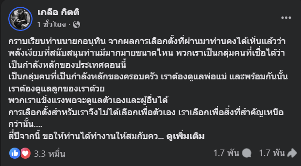 นักแสดง-พิธีกรชื่อดัง เกลือ-กิตติ เชี่ยววงศ์กุล โพสต์ร่ายยาวฝากถึงนายกอนุทิน ชาญวีรกูล ขอให้ทำงานให้สมกับความไว้วางใจจากประชาชนที่เลือกมาให้บริหารประเทศ