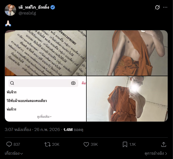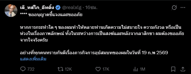 อย่างที่ทุกคนทราบกันดีเรื่องภารกิจการอุปสมบทของผมในวันที่19 ก.พ 2569 ซึ่งเป็นการตัดสินใจที่ผ่านการไตร่ตรองอย่างรอบคอบแล้ว การจัดงานและพิธีการถือเป็นงานภายในหรืองานปิดและเชิญคนใกล้ชิดที่สามารถสะดวกเดินทางมาร่วมงานได้ และภายในงานไม่มีการห้ามในการบันทึกภาพหรือวีดิโอแต่อย่างใด เพราะฉะนั้นทางตัวเลโก้เลยคำนึงถึงภาพที่จะเกิดขึ้นตั้งแต่ก่อนการอุปสมบทแล้วครับ และได้แจ้งทางครอบครัวไปแล้วในเรื่องสิ่งของที่จะนำมาถวาย ไม่ใช่เพื่อการเอาใจผู้ว่าจ้างแต่อย่างใด แต่เพื่อเป็นการให้เกียรติอีกหนึ่งหน้าที่ของเลโก้เองครับ