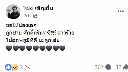 โดย น้าโย่ง โพสต์ภาพของน้องเอกพร้อมแคปชั่นว่า “ขอให้น้องเอก ลูกชาย ศักดิ์นรินทร์ ดาวร้าย ไปสู่ภพภูมิที่ดี นะลูกเอ้ย”