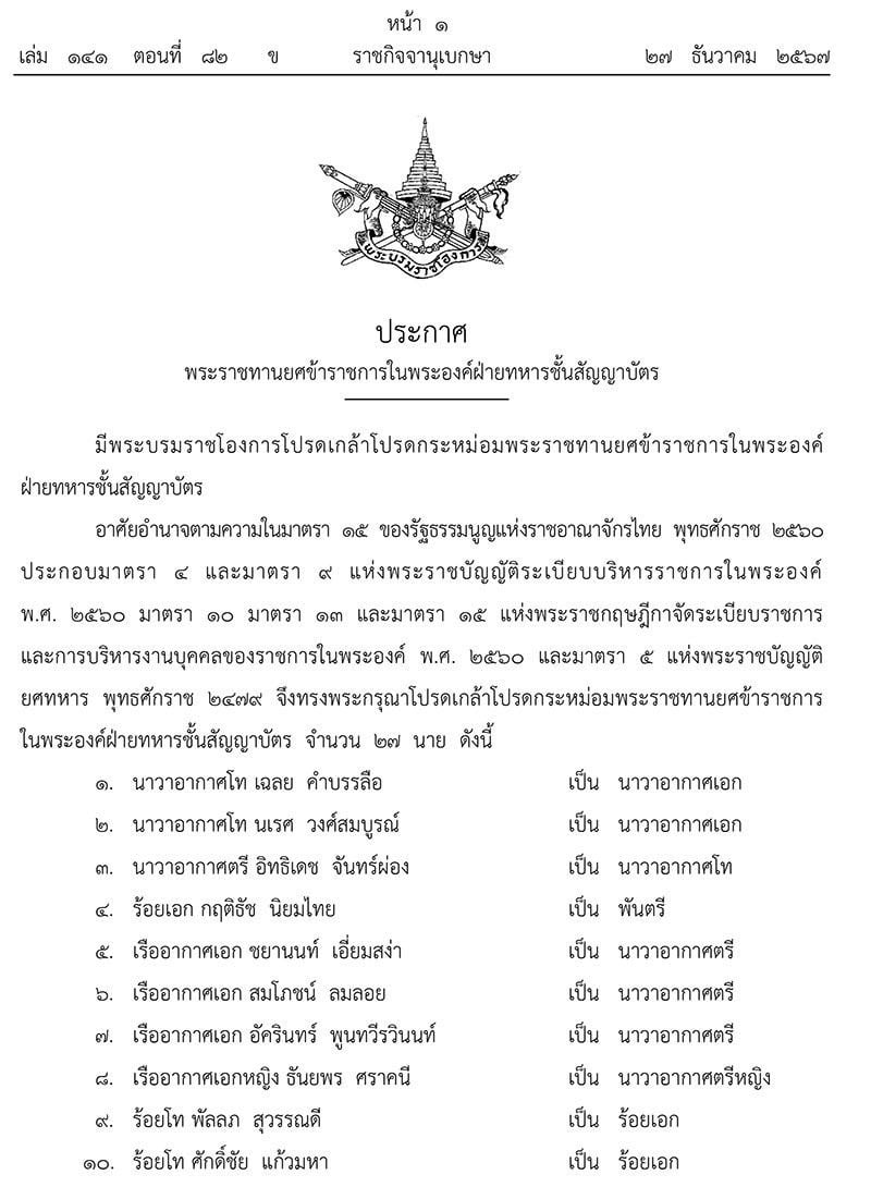 27 ธ.ค.2567 - เว็บไซต์ราชกิจจานุเบกษา เผยแพร่ประกาศพระราชทานยศข้าราชการในพระองค์ฝ่ายทหารชั้นสัญญาบัตร