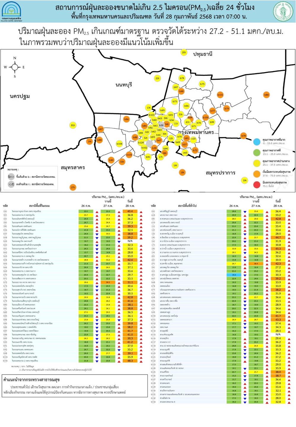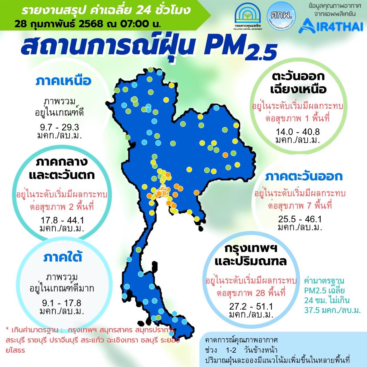 28 ก.พ. 2568 – ศูนย์สื่อสารการแก้ไขปัญหามลพิษทางอากาศ รายงานการติดตามตรวจสอบคุณภาพอากาศ ประจำวันที่ 28 กุมภาพันธ์ 2568 ณ 07:00 น. สรุปดังนี้