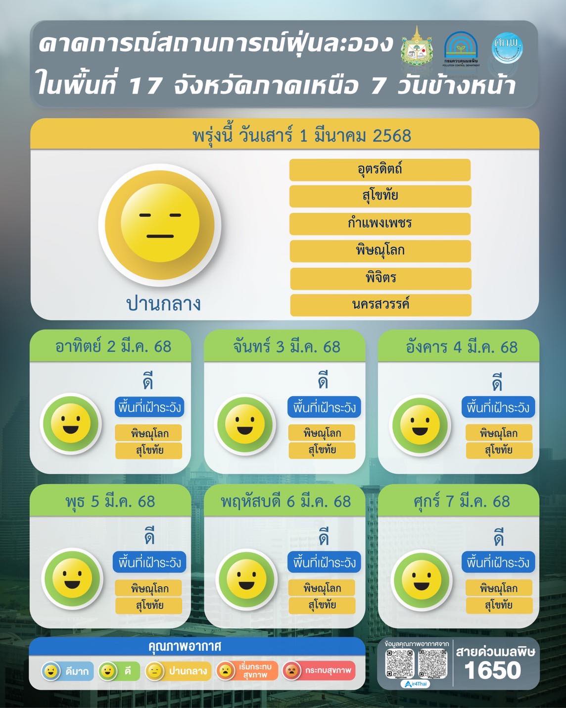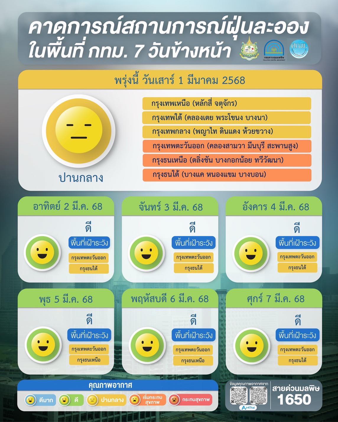 ผลการคาดการณ์สถานการณ์ฝุ่นละออง 7 วันข้างหน้า ระหว่างวันที่ 1 – 7 มีนาคม 2568