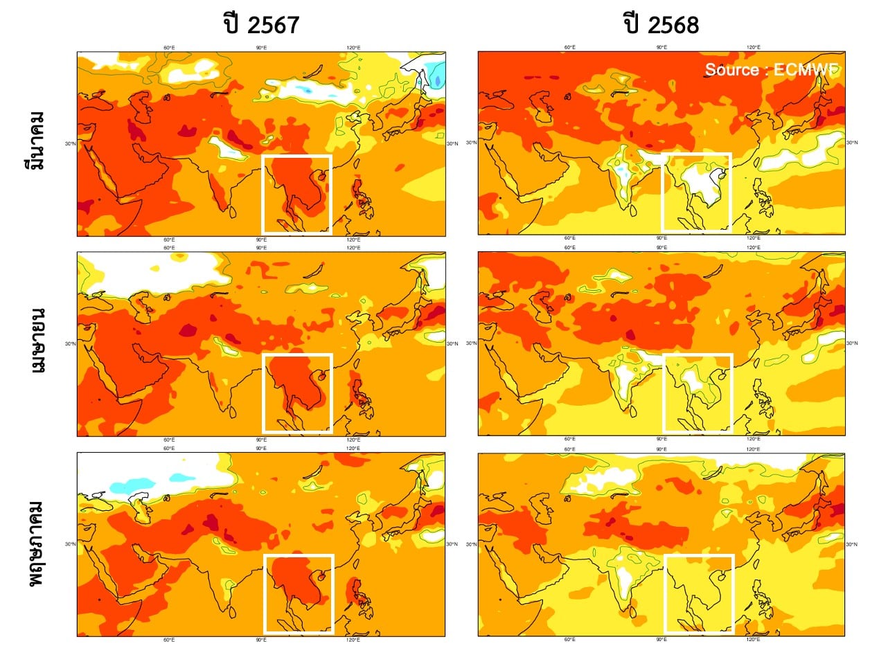 การคาดการณ์อุณหภูมิเฉลี่ย 3 เดือนข้างหน้า สำหรับปี 2568 จะไม่ร้อนเหมือนปี 2567 (กรอบสีขาว) ดังนั้นช่วงสงกรานต์นี้จึงจะไม่ร้อนสุดๆเหมือนปีที่แล้ว แต่ก็ยังคงถือว่าร้อนจัดอยู่น่ะครับ คาดว่าอุณหภูมิสูงสุดจะอยู่ประมาณ 43-44℃ (ปีที่แล้ว 46℃)