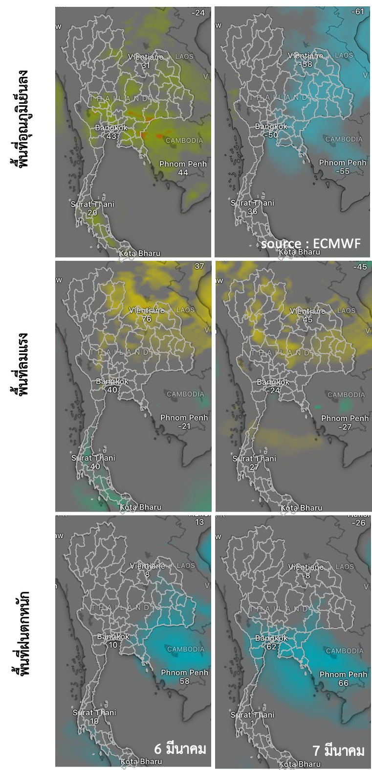จากร้อนในช่วงบ่าย จะเปลี่ยนไปเย็นสบาย อุณหภูมิในวันที่ 7 มีนาคมนี้จะลดฮวบฮาบ 4-5 ℃ ในภาคอีสานหลายพื้นที่ (จากเฉดสีเหลืองเป็นสีฟ้า) เมื่ออากาศร้อนเจออากาศเย็น มักจะมีพายุฝนฟ้าคะนองตามมา ทำให้มีลมแรงวันที่ 6-7 มีนาคม บริเวณภาคเหนือ และอีสานบน (เฉดสีเหลือง) และฝนจะตกหนักวันที่ 7 มีนาคม บริเวณภาคตะวันออก ภาคกลาง รวมทั้ง กทม. และภาคใต้ตอนบน (เฉดสีฟ้า) แต่ก็ไม่ได้ทำให้เกิดน้ำท่วมใหญ่ (อาจจะมีน้ำรอการระบายบ้างในชุมชนเมือง) เพราะตกหนักเพียงวันเดียว ช่วยผ่อนคลายฝุ่นพิษ PM2.5 ได้มากเลยน่ะครับ หลังจากนี้ก็จะกลับไปร้อนเหมือนเดิม