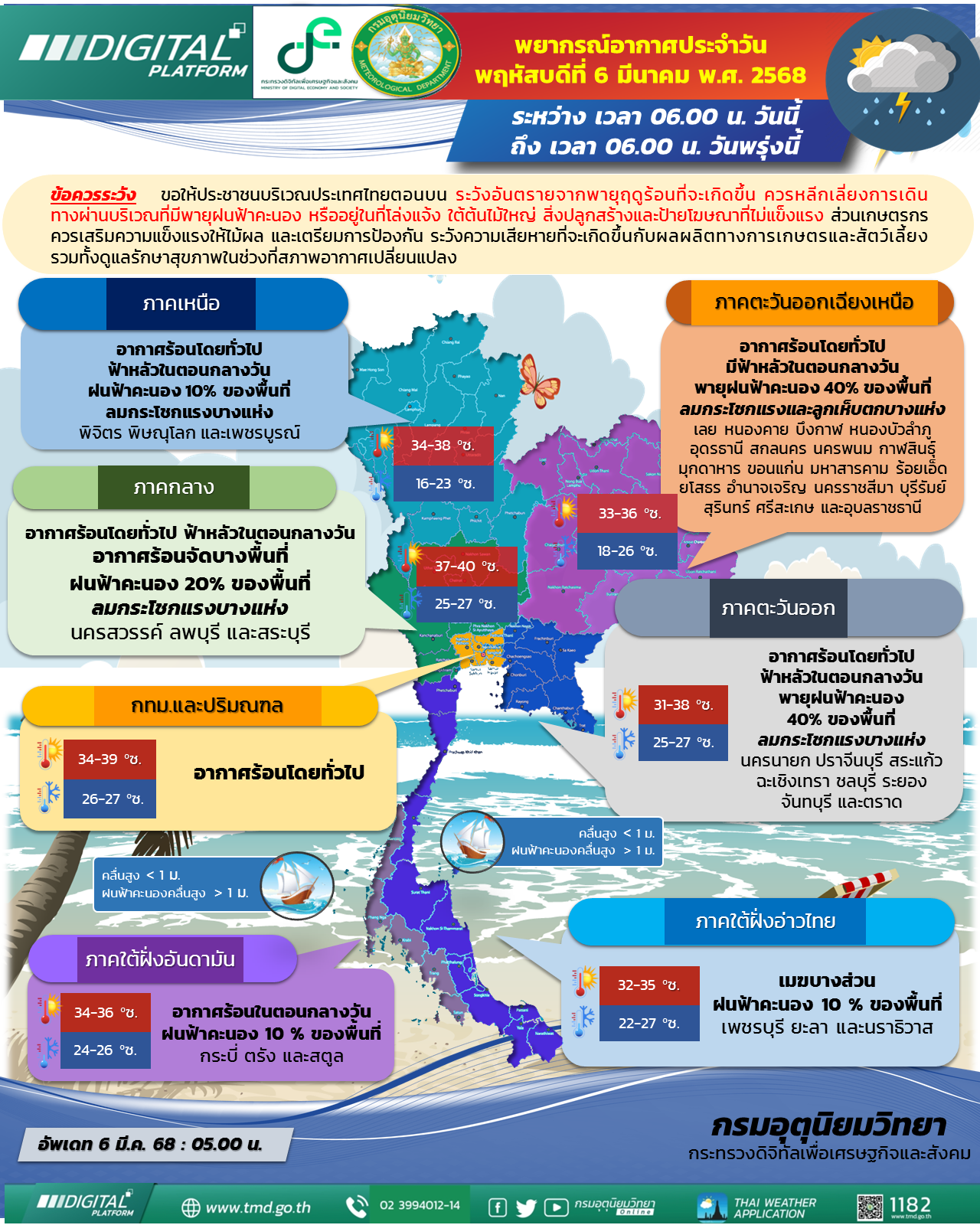 06 มี.ค.2568 - กรมอุตุนิยมวิทยาได้พยากรณ์อากาศ 24 ชั่วโมงข้างหน้าในลักษณะทั่วไป ว่าบริเวณภาคตะวันออกเฉียงเหนือ และภาคตะวันออก จะมีพายุฤดูร้อนเกิดขึ้น โดยมีลักษณะพายุฝนฟ้าคะนอง ฟ้าผ่า ลมกระโชกแรง และลูกเห็บตกบางแห่ง ในขณะที่ภาคอื่นๆ จะได้รับผลกระทบในระยะถัดไป โดยบริเวณประเทศไทยตอนบนยังคงมีอากาศร้อนโดยทั่วไป และมีอากาศร้อนจัดบางพื้นที่ในภาคเหนือและภาคกลาง ขอให้ประชาชนบริเวณประเทศไทยตอนบน ระวังอันตรายจากพายุฤดูร้อนที่จะเกิดขึ้น ควรหลีกเลี่ยงการเดินทาง ผ่านบริเวณที่มีพายุฝนฟ้าคะนอง หรืออยู่ในที่โล่งแจ้ง ใต้ต้นไม้ใหญ่ สิ่งปลูกสร้างและป้ายโฆษณาที่ไม่แข็งแรง ส่วนเกษตรกรควรเสริมความแข็งแรงให้ไม้ผล และเตรียมการป้องกัน ระวังความเสียหายที่จะเกิดขึ้นกับผลผลิตทางการเกษตรและสัตว์เลี้ยง รวมทั้งดูแลรักษาสุขภาพในช่วงที่สภาพอากาศเปลี่ยนแปลงไว้ด้วย