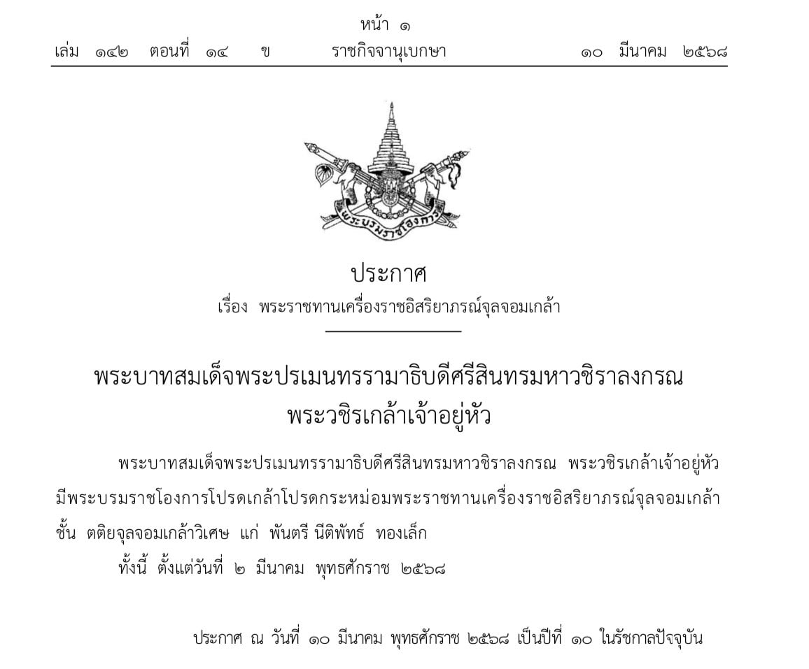 พระบาทสมเด็จพระปรเมนทรรามาธิบดีศรีสินทรมหาวชิราลงกรณ พระวชิรเกล้าเจ้าอยู่หัวมีพระบรมราชโองการโปรดเกล้าโปรดกระหม่อมพระราชทานเครื่องราชอิสริยาภรณ์จุลจอมเกล้าชั้น ตติยจุลจอมเกล้าวิเศษ แก่ พันตรี นีติพัทธ์ ทองเล็ก