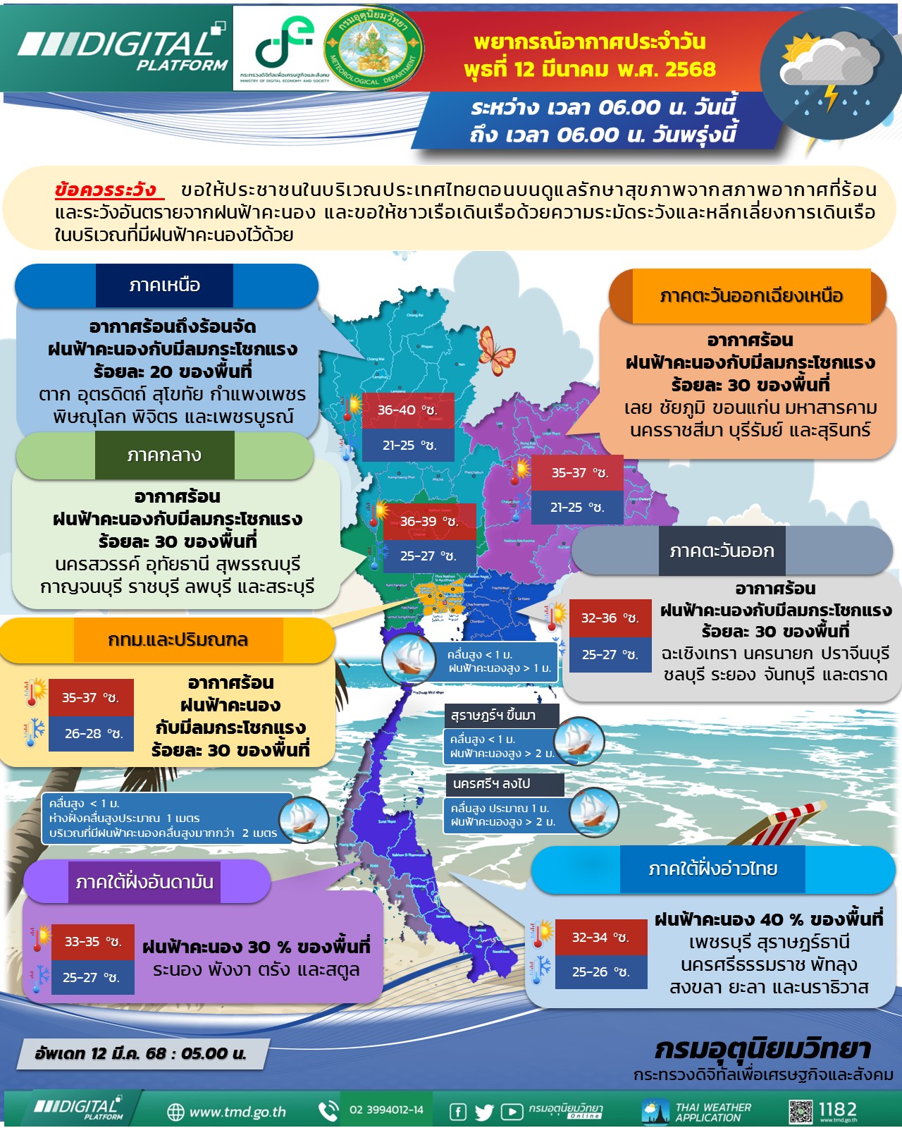12 มี.ค.2568 - กรมอุตุนิยมวิทยาได้พยากรณ์อากาศ 24 ชั่วโมงข้างหน้าในลักษณะทั่วไป ว่าประเทศไทยตอนบนมีอากาศร้อนโดยทั่วไปและมีฝนฟ้าคะนองกับมีลมกระโชกแรงบางแห่ง ขอให้ประชาชนดูแลรักษาสุขภาพจากสภาพอากาศที่ร้อน และระวังอันตรายจากฝนฟ้าคะนอง เนื่องจากมีแนวพัดสอบของลมตะวันตกเฉียงใต้และลมตะวันออกเฉียงใต้พัดปกคลุมภาคเหนือตอนล่าง ภาคกลาง และภาคตะวันออกเฉียงเหนือ ในขณะที่ประเทศไทยตอนบนมีอากาศร้อนโดยทั่วไป
