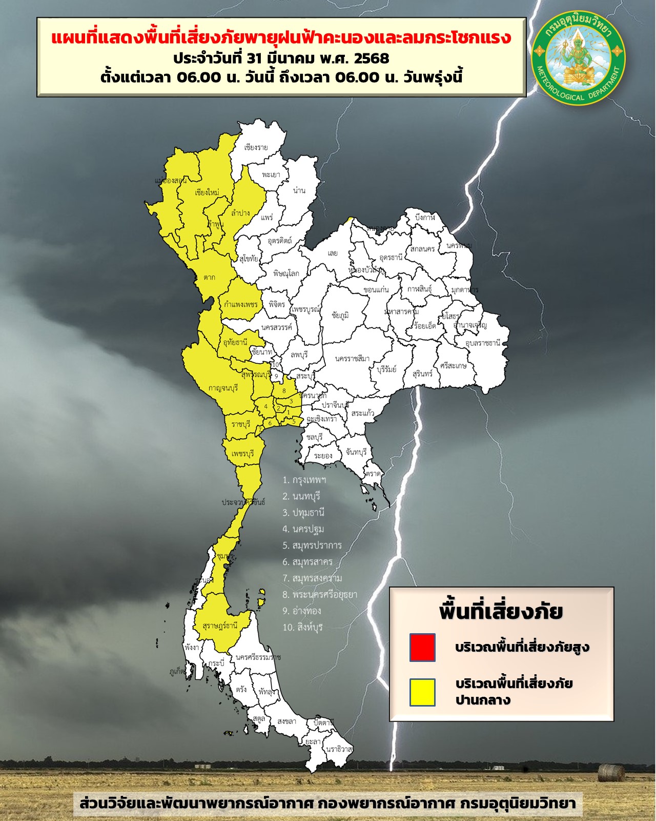 31 มี.ค. 2568 – กรมอุตุนิยมวิทยา พยากรณ์อากาศ 24 ชั่วโมงข้างหน้าว่า บริเวณภาคเหนือ ภาคกลาง รวมทั้งกรุงเทพมหานครและปริมณฑล และภาคใต้ตอนบน จะมีพายุฤดูร้อนเกิดขึ้น โดยมีลักษณะของพายุฝนฟ้าคะนอง ลมกระโชกแรง และลูกเห็บตกบางแห่ง รวมถึงอาจมีฟ้าผ่าเกิดขึ้นได้บางพื้นที่ เนื่องจากบริเวณความกดอากาศสูงหรือมวลอากาศเย็นกำลังปานกลางจากประเทศจีนแผ่ลงมาปกคลุมภาคตะวันออกเฉียงเหนือและทะเลจีนใต้ ในขณะที่ประเทศไทยมีอากาศร้อน ขอให้ประชาชนในบริเวณดังกล่าวระวังอันตรายจากพายุฤดูร้อนที่จะเกิดขึ้นโดยหลีกเลี่ยงการเดินทางผ่านบริเวณที่มีพายุฝนฟ้าคะนอง อยู่ในที่โล่งแจ้ง ใต้ต้นไม้ใหญ่ สิ่งปลูกสร้าง และป้ายโฆษณาที่ไม่แข็งแรง เกษตรกรควรเตรียมการป้องกันระวังความเสียหายที่อาจจะเกิดขึ้นกับผลผลิตทางการเกษตรและสัตว์เลี้ยง รวมทั้งดูแลรักษาสุขภาพในช่วงที่สภาพอากาศเปลี่ยนแปลงไว้ด้วย