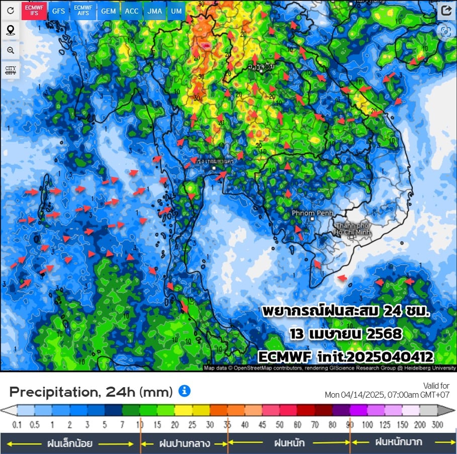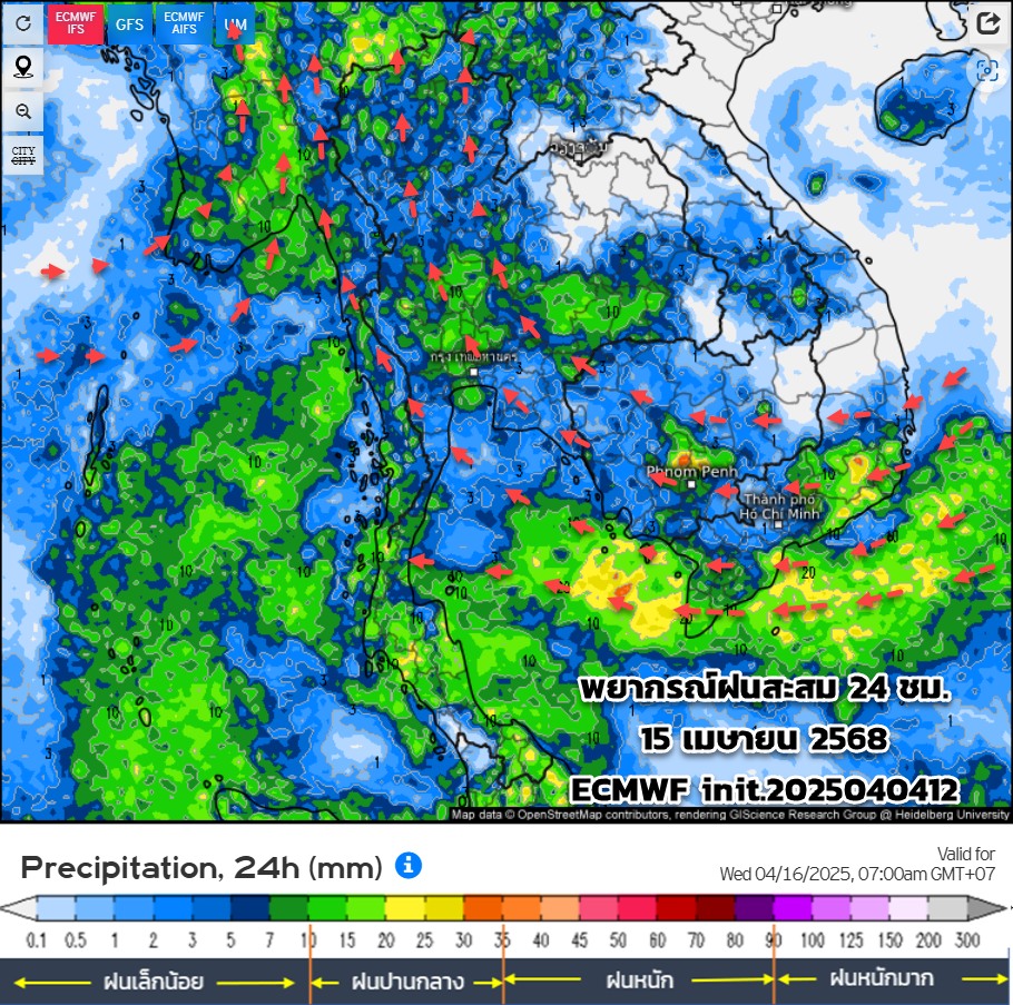 5 เมษายน 2568 - กรมอุตุนิยมวิทยา อัพเดทผลการพยากรณ์ฝนสะสมรายวัน (ทุกๆ 24 ชม.:(นับตั้งแต่ 07.00น. ถึง 07.00น.วันรุ่งขึ้น) และลมที่ระดับ 925hPa (750 ม.)15 วันล่วงหน้า ระหว่าง 5 -19 เม.ย.68 init. 2025040412 จากศูนย์พยากรณ์อากาศระยะกลางยุโรป (ECMWF) วิเคราะห์ตามผลจากแบบจำลองฯ เฉดสีแดงหมายถึงฝนหนัก สีเขียวหมายถึงฝนเล็กน้อย