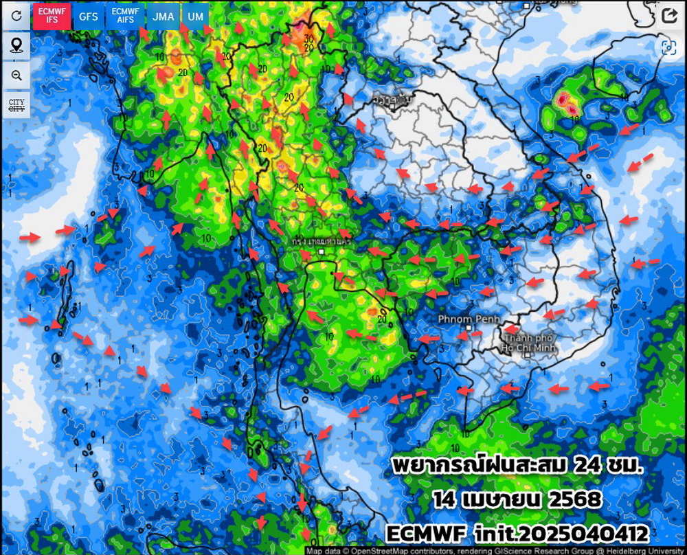 5 เมษายน 2568 - กรมอุตุนิยมวิทยา อัพเดทผลการพยากรณ์ฝนสะสมรายวัน (ทุกๆ 24 ชม.:(นับตั้งแต่ 07.00น. ถึง 07.00น.วันรุ่งขึ้น) และลมที่ระดับ 925hPa (750 ม.)15 วันล่วงหน้า ระหว่าง 5 -19 เม.ย.68 init. 2025040412 จากศูนย์พยากรณ์อากาศระยะกลางยุโรป (ECMWF) วิเคราะห์ตามผลจากแบบจำลองฯ เฉดสีแดงหมายถึงฝนหนัก สีเขียวหมายถึงฝนเล็กน้อย