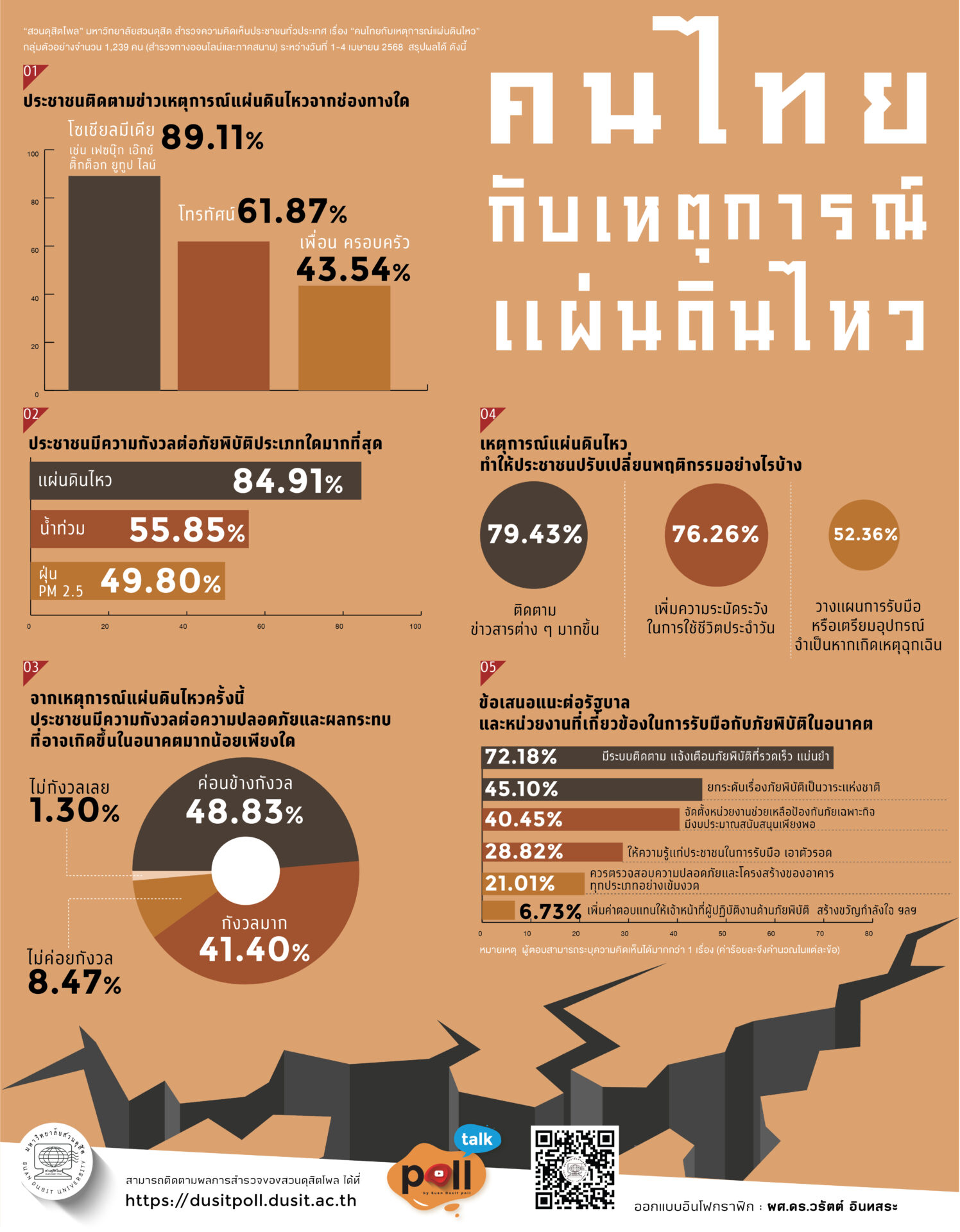 6 เม.ย. 2568 สวนดุสิตโพล มหาวิทยาลัยสวนดุสิต สำรวจความคิดเห็นประชาชนทั่วประเทศต่อกรณี “คนไทยกับเหตุการณ์แผ่นดินไหว” กลุ่มตัวอย่างจำนวน 1,239 คน (สำรวจทางออนไลน์และภาคสนาม) ระหว่างวันที่ 1-4 เมษายน 2568 พบว่า กลุ่มตัวอย่างติดตามข่าวเหตุการณ์แผ่นดินไหวจากสื่อโซเชียลมีเดีย (เฟซบุ๊ก เอ๊กซ์ ติ๊กต็อก ยูทูป ไลน์) มากที่สุด ร้อยละ 89.11 และมีความกังวลต่อภัยพิบัตินี้ ร้อยละ 84.91 จากเหตุการณ์แผ่นดินไหวครั้งนี้ทำให้ประชาชนค่อนข้างกังวลต่อความปลอดภัยและผลกระทบที่อาจเกิดขึ้นในอนาคต ร้อยละ 48.83 ส่งผลให้ประชาชนปรับเปลี่ยนพฤติกรรมโดยการติดตามข่าวสารต่างๆมากขึ้น ร้อยละ 79.43 ทั้งนี้กลุ่มตัวอย่างต้องการให้รัฐบาลและหน่วยงานที่เกี่ยวข้องมีระบบติดตาม แจ้งเตือนภัยพิบัติที่รวดเร็ว แม่นยำ ร้อยละ 72.18 รองลงมาคือ ยกระดับเรื่องภัยพิบัติเป็นวาระแห่งชาติ ร้อยละ 45.10