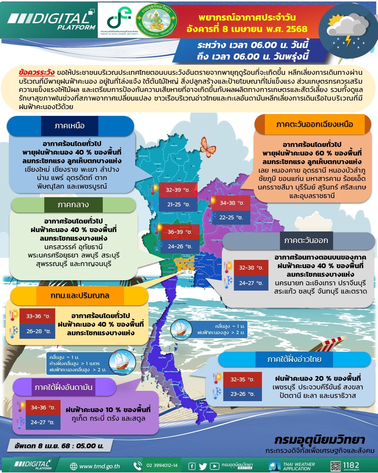8 เม.ย.2568- กรมอุตุนิยมวิทยาพยากรณ์อากาศ 24 ชั่วโมงข้างหน้า ประเทศไทยตอนบนมีพายุฤดูร้อนเกิดขึ้น โดยมีลักษณะของพายุฝนฟ้าคะนอง ลมกระโชกแรง และลูกเห็บตกบางแห่ง เนื่องจากบริเวณความกดอากาศสูงหรือมวลอากาศเย็นกำลังปานกลางปกคลุมภาคตะวันออกเฉียงเหนือตอนบนและทะเลจีนใต้ ส่งผลให้มีลมใต้และลมตะวันออกเฉียงใต้พัดปกคลุมประเทศไทยตอนบน ในขณะที่ประเทศไทยตอนบนมีอากาศร้อนโดยทั่วไป ขอให้ประชาชนบริเวณประเทศไทยตอนบนระวังอันตรายจากพายุฤดูร้อนที่จะเกิดขึ้น หลีกเลี่ยงการเดินทางผ่านบริเวณที่มีพายุฝนฟ้าคะนอง อยู่ในที่โล่งแจ้ง ใต้ต้นไม้ใหญ่ สิ่งปลูกสร้างและป้ายโฆษณาที่ไม่แข็งแรง ส่วนเกษตรกรควรเสริมความแข็งแรงให้ไม้ผล และเตรียมการป้องกันความเสียหายที่อาจเกิดขึ้นกับผลผลิตทางการเกษตรและสัตว์เลี้ยง รวมทั้งดูแลรักษาสุขภาพในช่วงที่สภาพอากาศเปลี่ยนแปลงไว้ด้วย