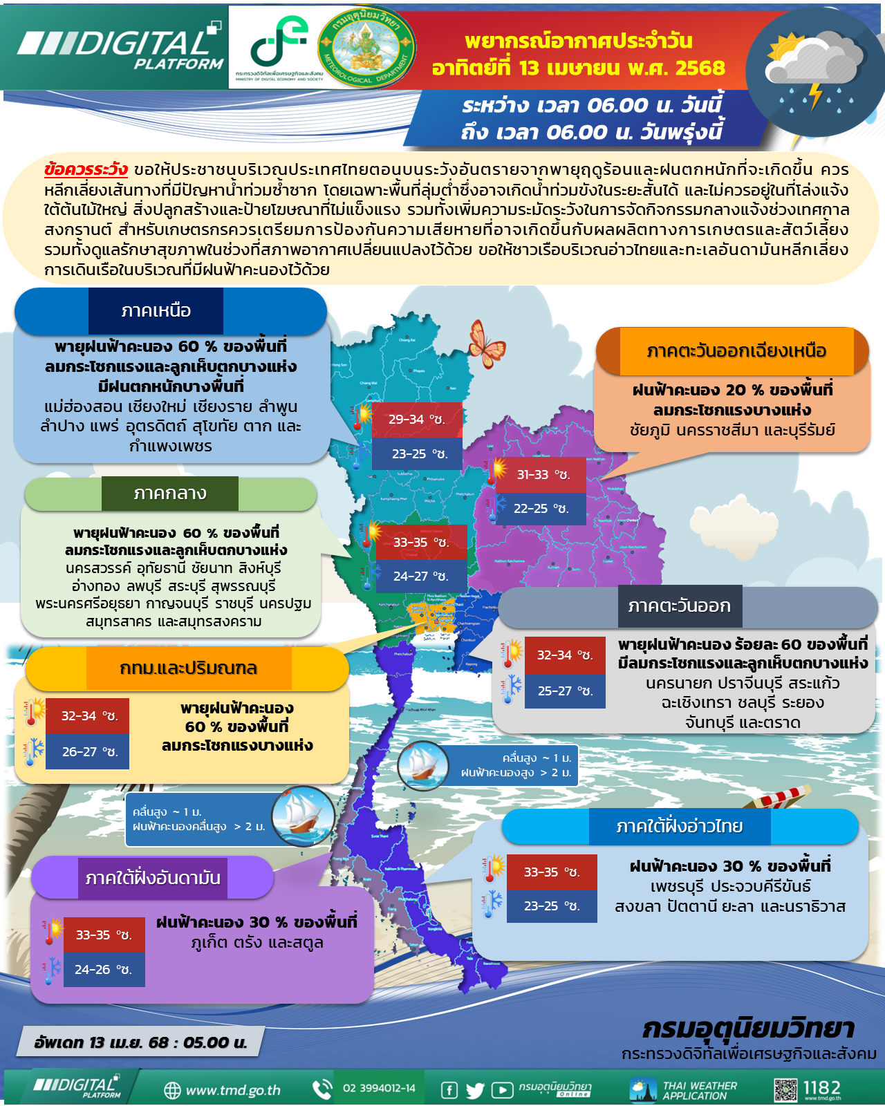 13 เมษายน 2568 กรมอุตุนิยมวิทยา รายงานลักษณะอากาศทั่วไป พยากรณ์อากาศ 24 ชั่วโมงข้างหน้า ประเทศไทยตอนบนมีพายุฤดูร้อนเกิดขึ้น โดยมีลักษณะของพายุฝนฟ้าคะนอง ลมกระโชกแรง และลูกเห็บตก รวมถึงอาจมีฟ้าผ่าเกิดขึ้นได้บางพื้นที่ กับมีฝนตกหนักบางแห่งในภาคเหนือ ขอให้ประชาชนบริเวณประเทศไทยตอนบน ระวังอันตรายจากพายุฤดูร้อนและฝนตกหนักที่จะเกิดขึ้น ควรหลีกเลี่ยงเส้นทางที่มีปัญหาน้ำท่วมซ้ำซาก โดยเฉพาะพื้นที่ลุ่มต่ำซึ่งอาจเกิดน้ำท่วมขังในระยะสั้นได้ และไม่ควรอยู่ในที่โล่งแจ้ง ใต้ต้นไม้ใหญ่ สิ่งปลูกสร้างและป้ายโฆษณาที่ไม่แข็งแรง รวมทั้งเพิ่มความระมัดระวังในการจัดกิจกรรมกลางแจ้งช่วงเทศกาลสงกรานต์