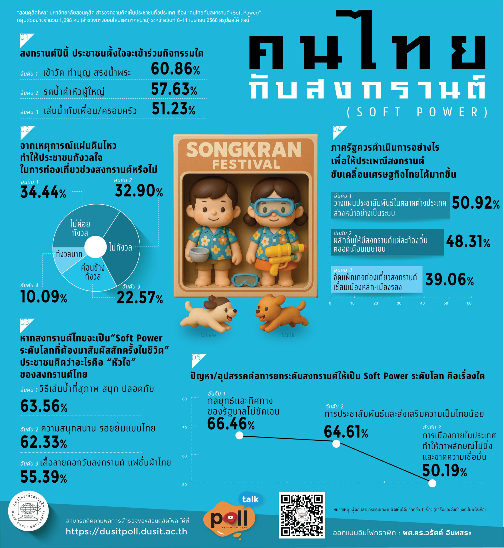 นางสาวพรพรรณ บัวทอง ประธานสวนดุสิตโพล ระบุว่า “หัวใจของสงกรานต์ไทย” ที่ประชาชนอยากนำเสนอให้ ทั่วโลกรู้จัก คือการเล่นน้ำแบบไทยที่สุภาพ สนุกและปลอดภัย ควบคู่ไปกับรอยยิ้มและบรรยากาศความสนุกสนานแบบไทย ๆ แม้จะเกิดเหตุการณ์แผ่นดินไหวในช่วงก่อนเทศกาล แต่ประชาชนส่วนใหญ่ยังไม่รู้สึกกังวลและยังคงวางแผนเดินทางท่องเที่ยวตามปกติ ถือเป็นโอกาสสำคัญทางเศรษฐกิจที่รัฐบาลไม่ควรมองข้าม พร้อมแนะนำให้ภาครัฐเร่งวางแผนประชาสัมพันธ์สงกรานต์ไทยในต่างประเทศอย่างเป็นระบบ หากต้องการยกระดับสงกรานต์ให้เป็น Soft Power ระดับโลกอย่างแท้จริง