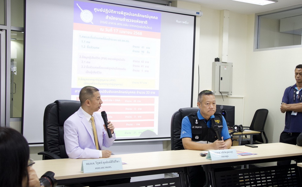 ศูนย์ปฏิบัติการพิสูจน์เอกลักษณ์บุคคล สำนักงานตำรวจแห่งชาติ ได้ดำเนินการตามกระบวนการพิสูจน์เอกลักษณ์บุคคล โดยมีการเก็บข้อมูลผู้สูญหายและDNA จากญาติ จำนวน 97 ราย เพื่อใช้เปรียบเทียบกับศพที่ส่งมายังสถาบันนิติเวชโรงพยาบาลตำรวจ โดยการตรวจเปรียบเทียบยืนยัน ได้แก่ ลายพิมพ์นิ้วมือ ข้อมูลทันตกรรม DNA และข้อมูลทางกายภาพ ตั้งแต่ 29 มี.ค. ถึง 17 เม.ย.68 มีศพที่เข้าสู่กระบวนการพิสูจน์เอกลักษณ์บุคคลแล้ว จำนวน 42 ราย และชิ้นส่วนศพจำนวนมาก สามารถตรวจพิสูจน์เอกลักษณ์บุคคลยืนยันว่าผู้เสียชีวิตเป็นใครได้ จำนวน 33 ราย ซึ่งได้แจ้งญาติมารับศพแล้ว