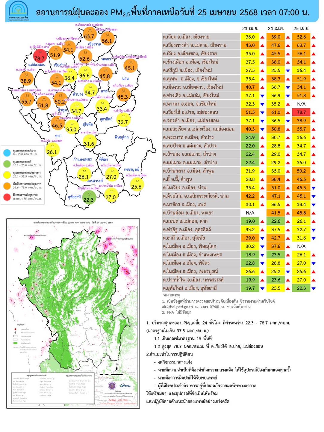 25 เม.ย. 2568 – ศูนย์สื่อสารการแก้ไขปัญหามลพิษทางอากาศ รายงานการติดตามตรวจสอบคุณภาพอากาศ ประจำวันที่ 25 เมษายน 2568 ณ 07:00 น. สรุปดังนี้